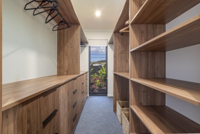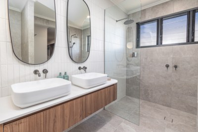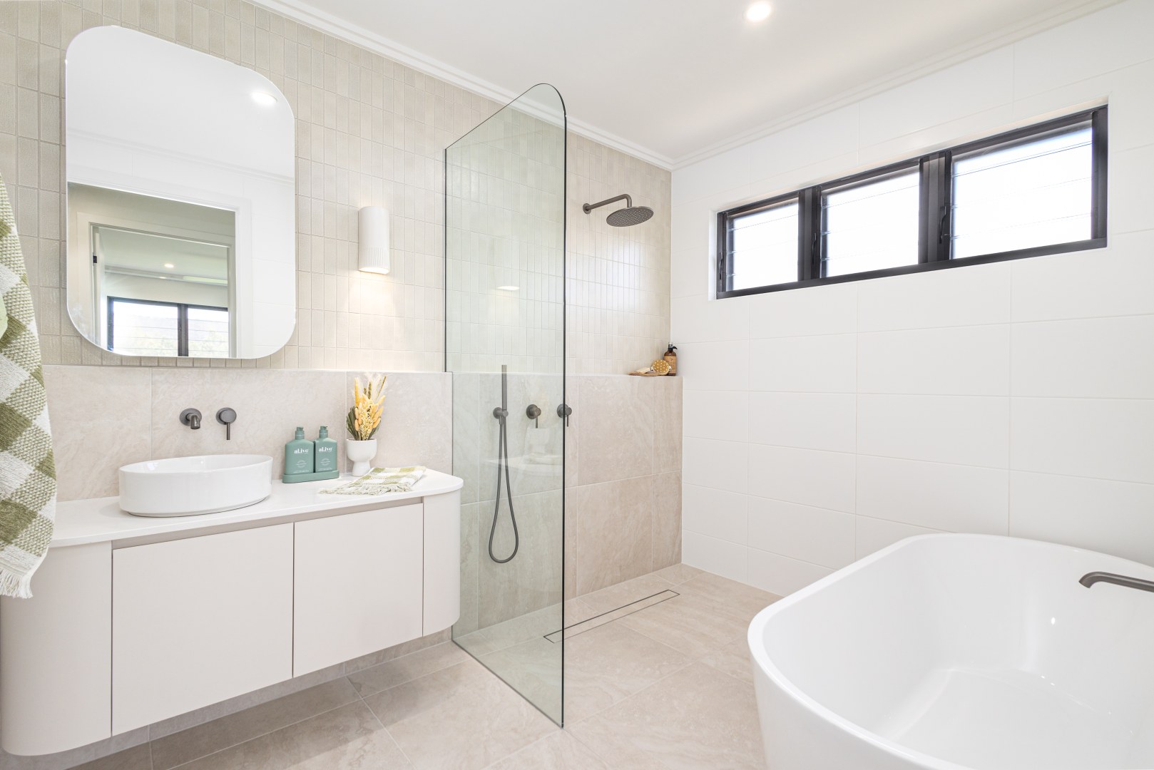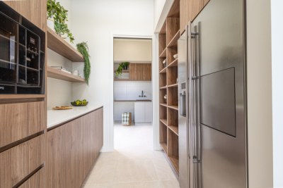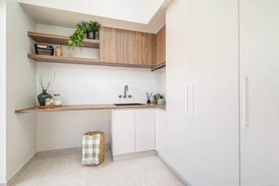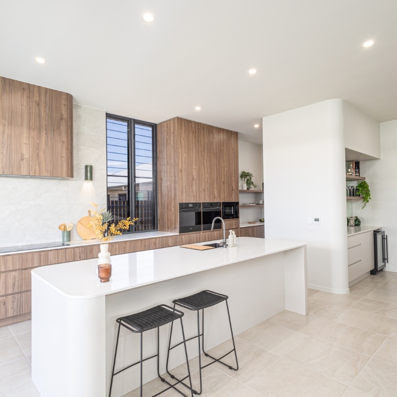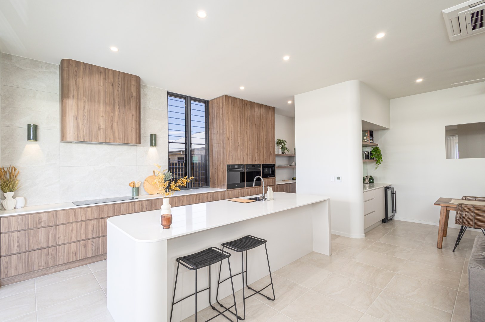 Bathed in natural light, the PVH Display Home showcases a stunning fusion of mid-century modern design with a touch of tropical flair. Warm greys and rich walnut tones, create a tranquil yet sophisticated atmosphere. The expansive kitchen takes centre stage, featuring a dramatic run of polytec Notaio Walnut cabinetry. The house features soft curves throughout, and the addition of thermo-laminate panels as a feature headboard complements the luxurious ensuite and walk in robe.