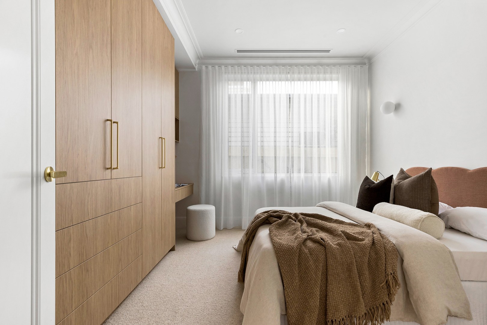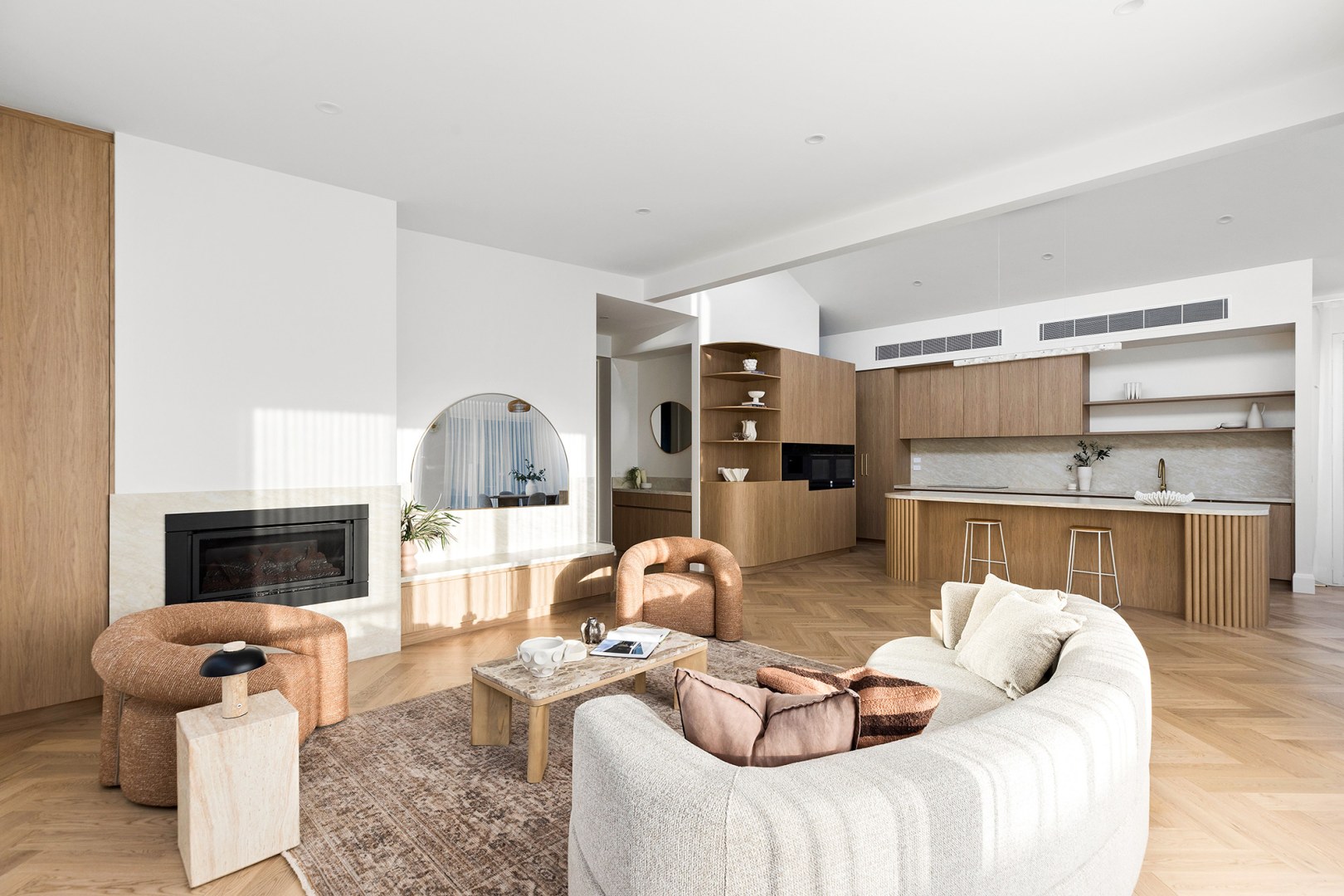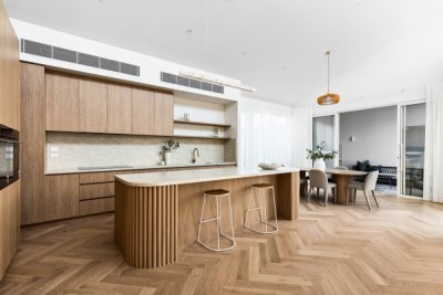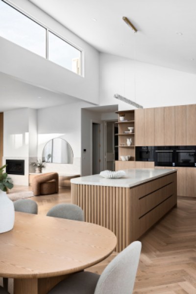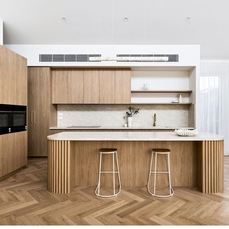 Rain Homes reimagined a 1920s Californian bungalow in Coburg, Melbourne. Restoring its charm while opening it to light, nature and modern living. Boston Oak Woodmatt anchors the palette, bringing a calm, biophilic warmth through the kitchen and main living spaces. Textural Steccawood in Boston Oak was used detailing echoes the organic rhythm of timber logs, while Champagne Stone by WK Stone completes the natural harmony. Fully gutted and thoughtfully rebuilt, the home now blends heritage soul with a fresh, contemporary extension.