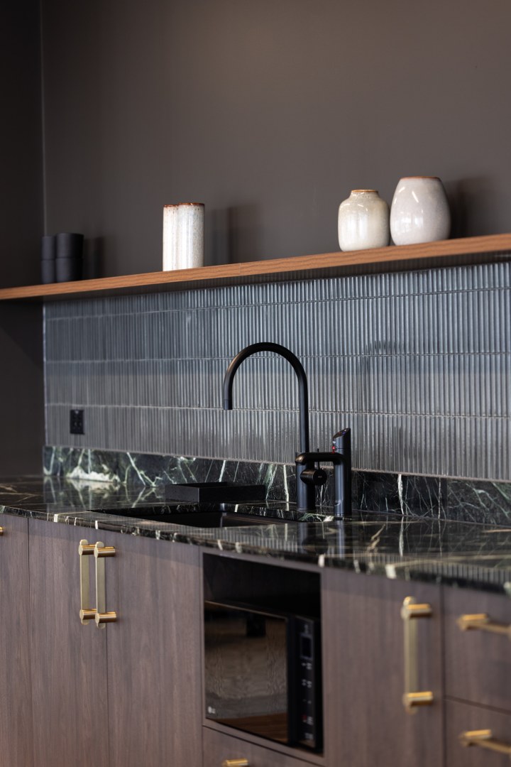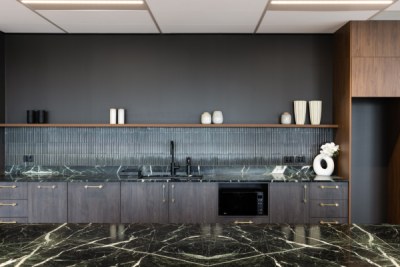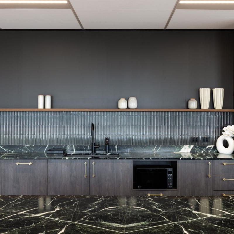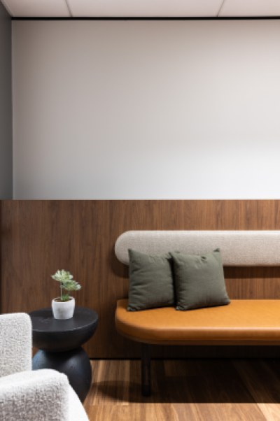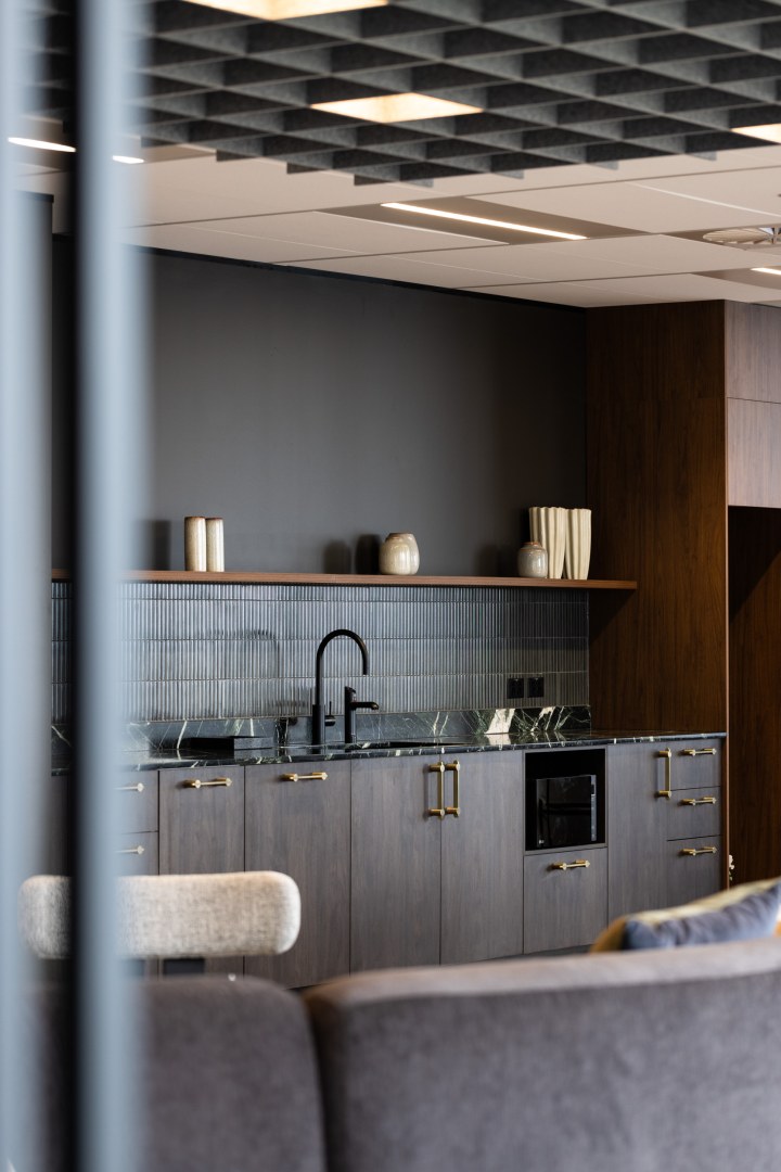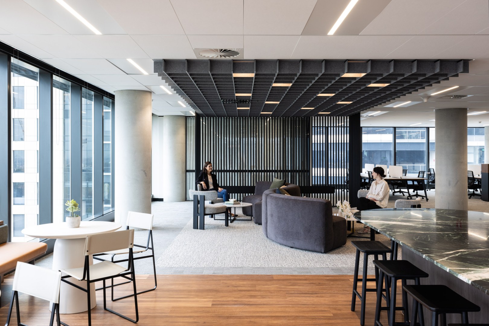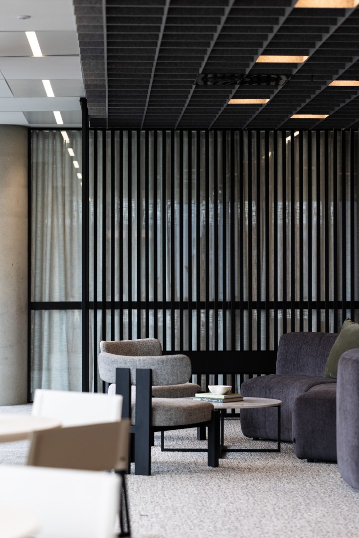 With Sheldon’s experience across multiple floors in this new building in St Leonards, we were approached by agricultural insurance company Rural Affinity to design their new workplace. A collaborative social space with curved furniture and relaxed seating forms a striking focal point. Dark joinery battening and planter boxes are framed on one side, and a grid-like acoustic paneling on the ceiling distinguishes the space. This workplace is a perfectly tailored solution for Rural Affinity.