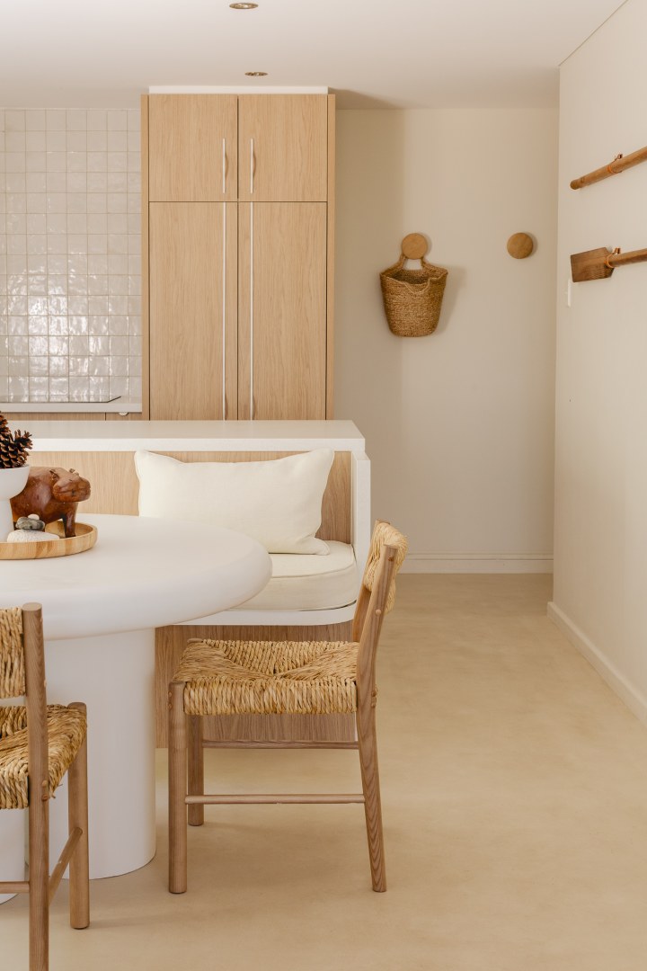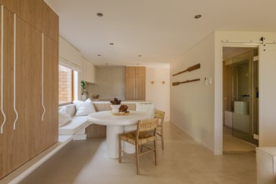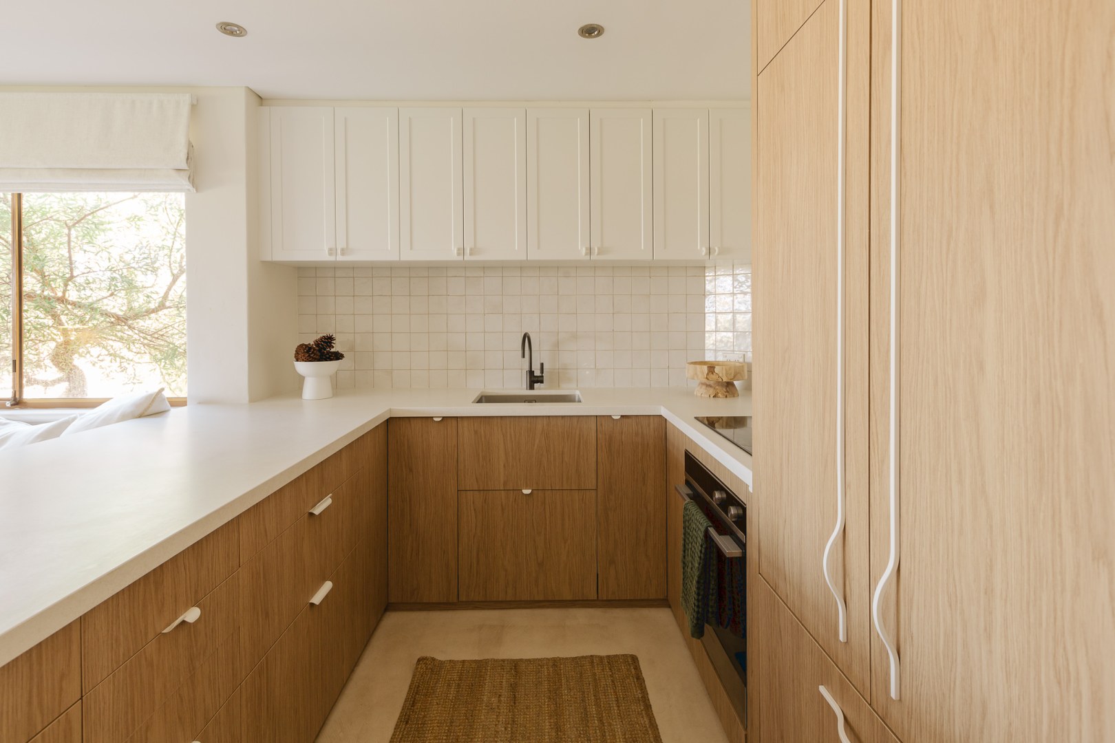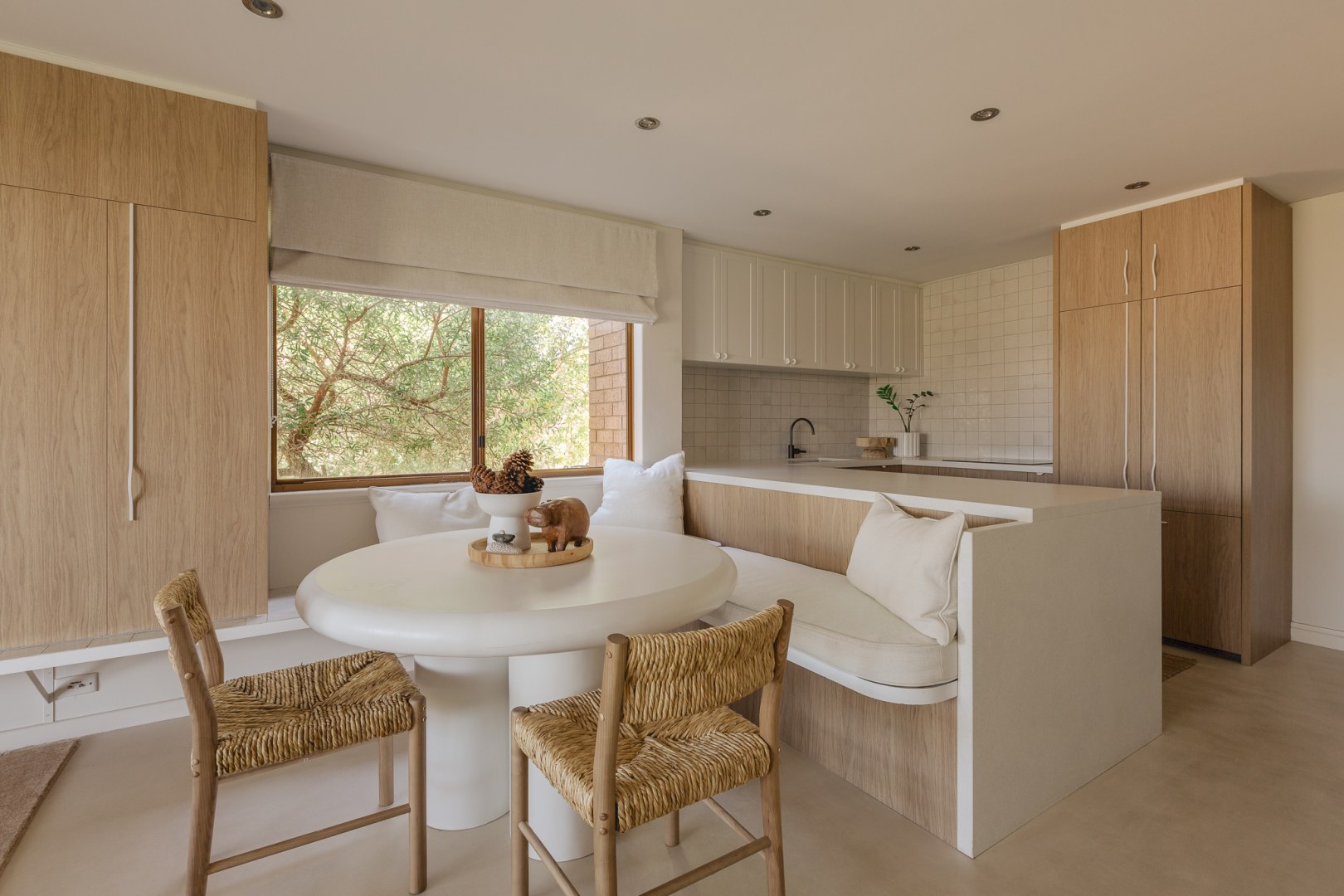 Bond Theory was approached to breathe new life into this old school apartment 70’s. This compact space was to be designed efficiently to capture living needs whilst creating a modern ocean retreat. The textural creamy palette showcases polytec’s Boston Oak and natural white paired with reflective Spanish hand cut ceramics and smooth micro-cement.