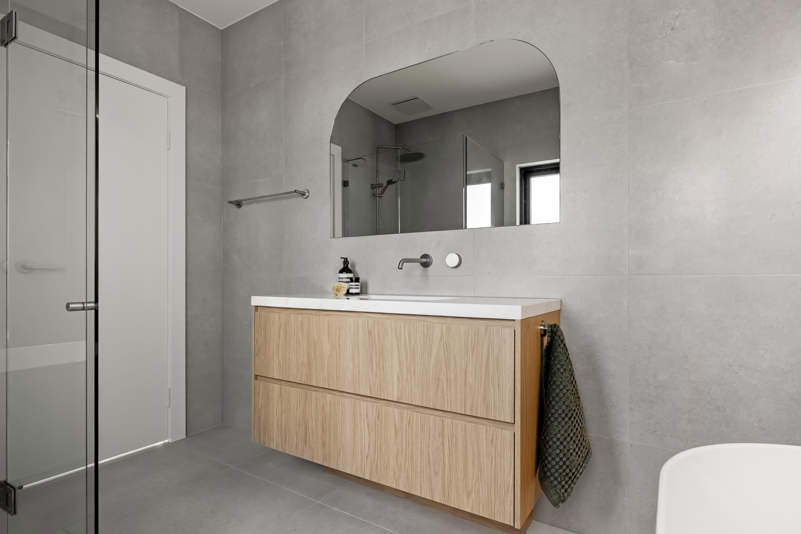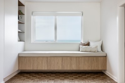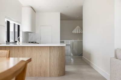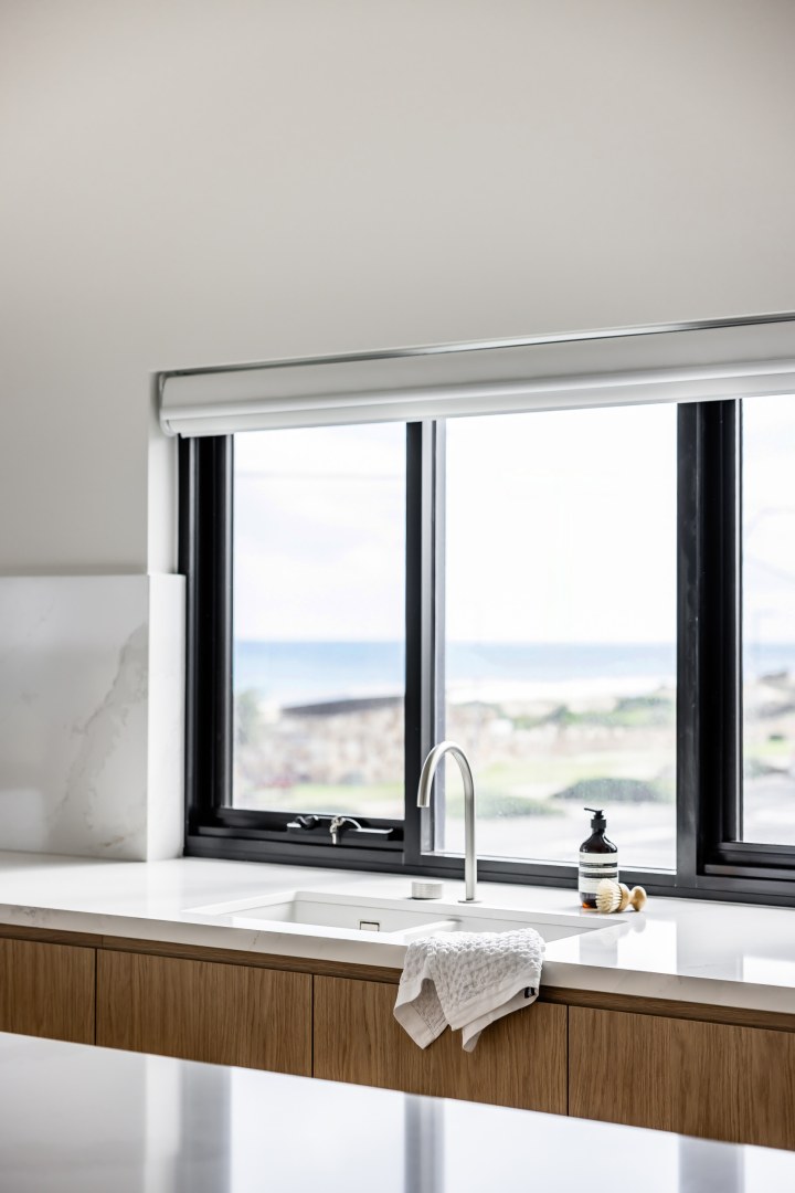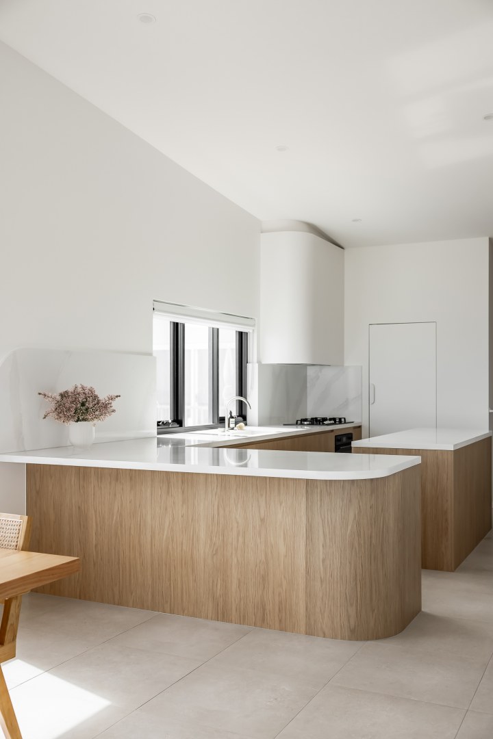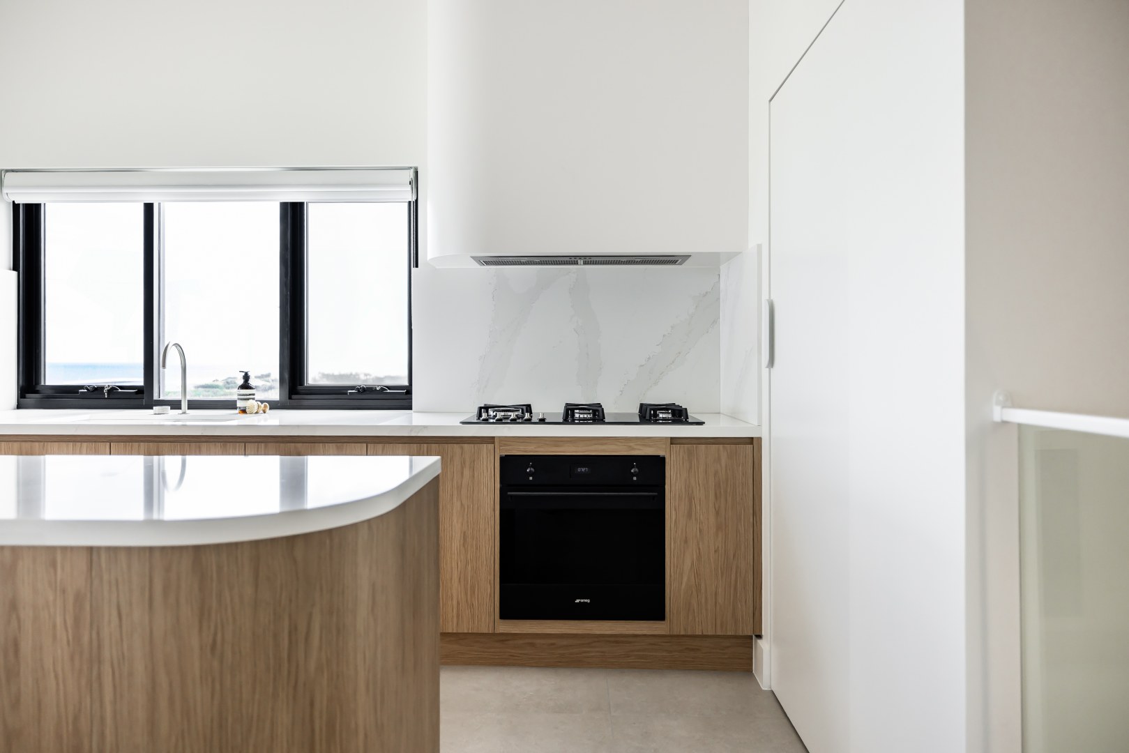 The focus for this coastal renovation was on the concept of 'flow' moving the user around the space and out toward the ocean. From the rangehood cover that arches and merges into the Eastern wall, to the curvature of the joinery and stone details, each element directs movement and encourages the overall sense of flow. For a project on the esplanade, the warmer, soft & subtle Cotton White paired with the rich and intricate Boston Oak creates an overall sense of balance & harmony in the space.