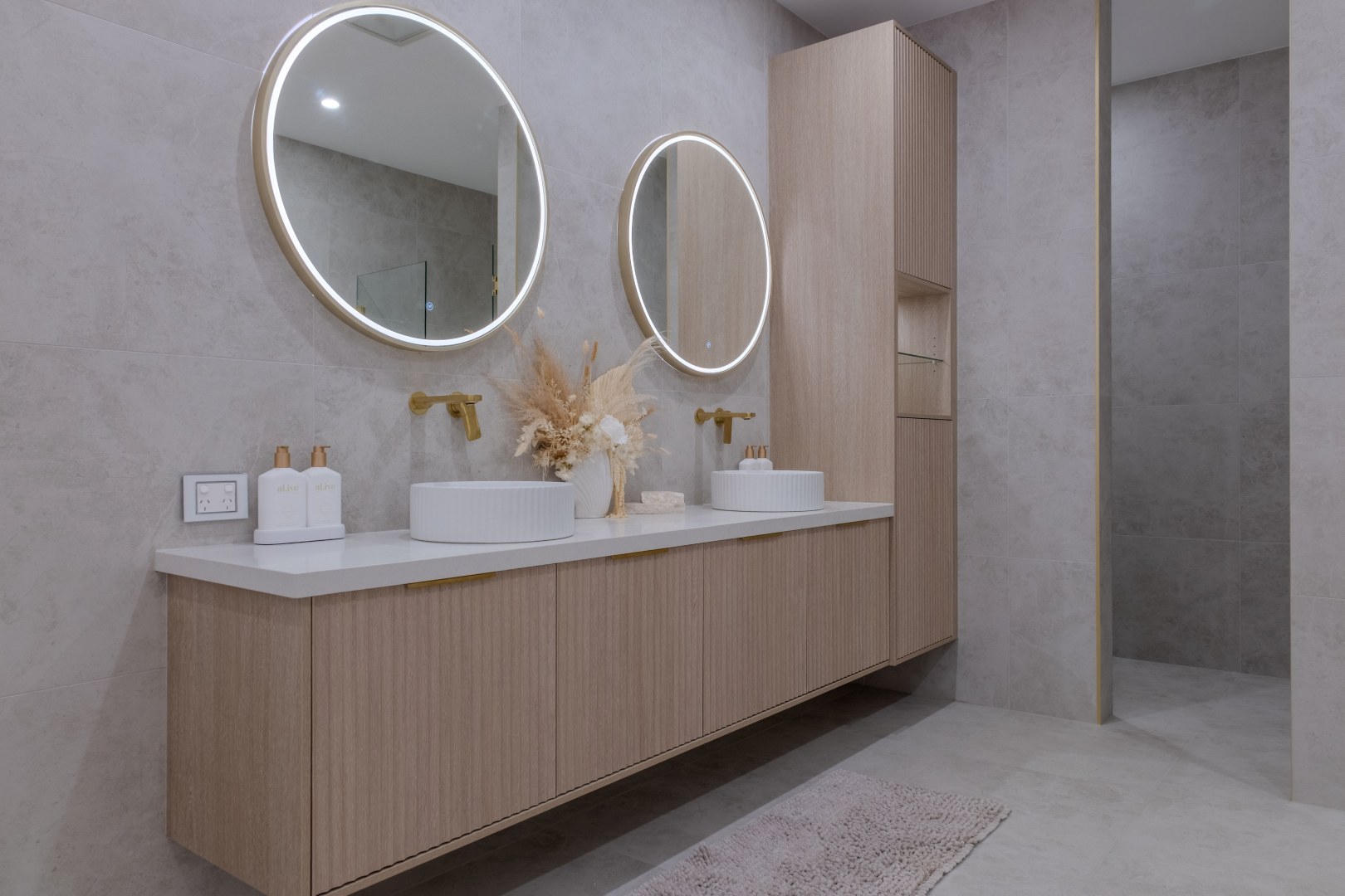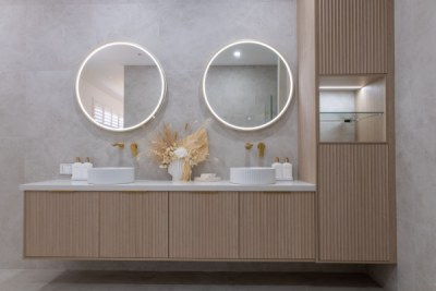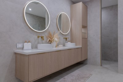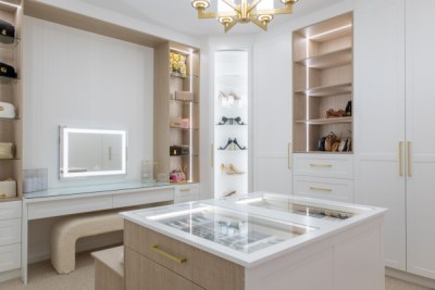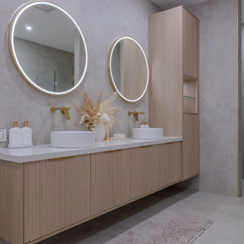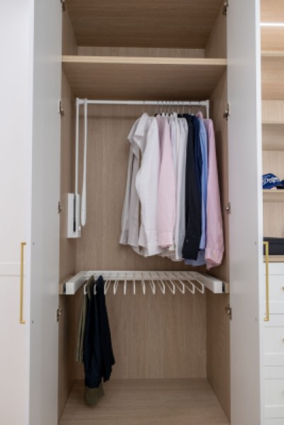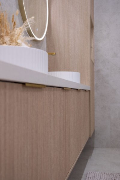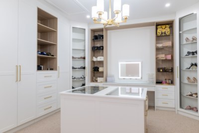Stunning custom walk in robe featuring polytec Coastal Oak Woodmatt internal cabinetry with polyurethane shaker profile doors. Custom vanity in polytec Coastal Oak Woodmatt featuring polytec Cove 25 doors and drawers complimented with brass fittings.