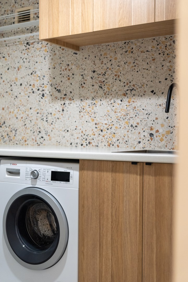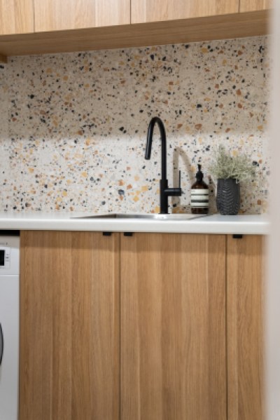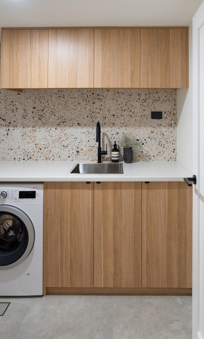 Where contemporary interiors meet coastal ambience, this project combines textures of terrazzo and stone with polytec Natural Oak Ravine. The use of polytec Snow Fabrini in the laundry, complements the design but provides durability and is practical for family living.