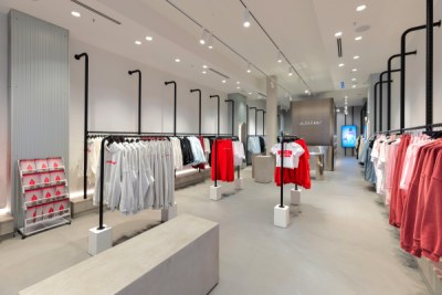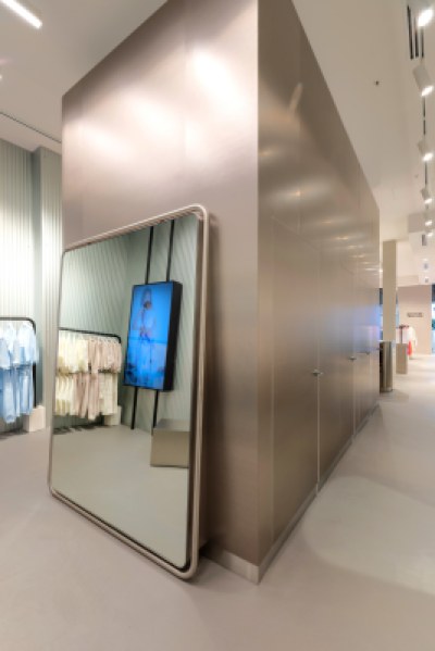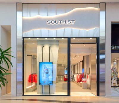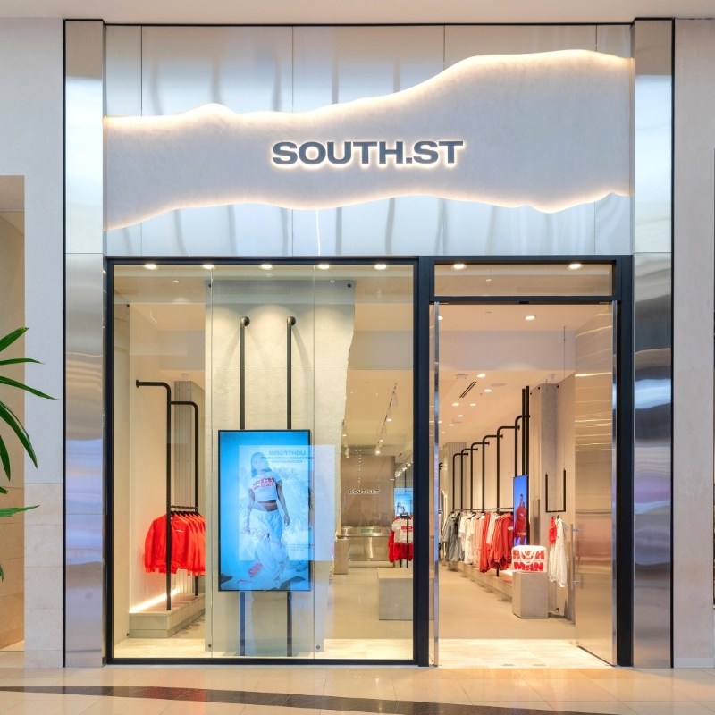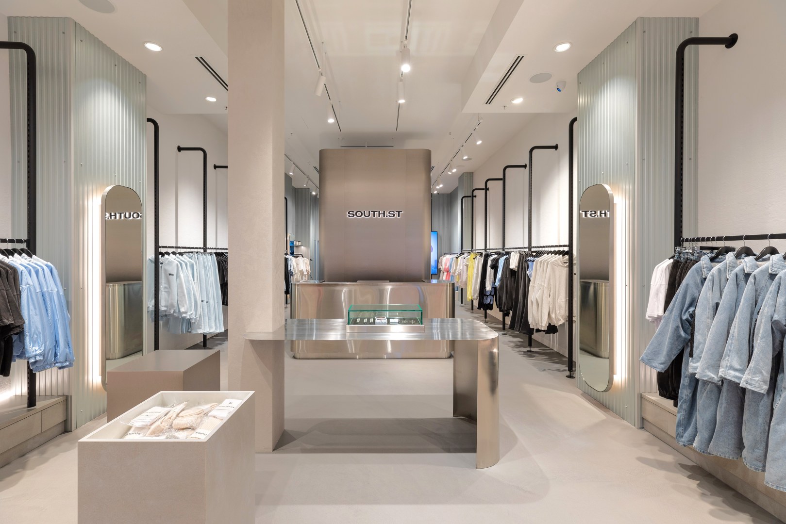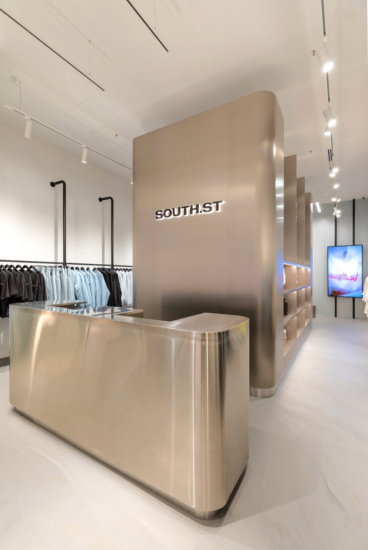 Inspired by its London sister store, the new SOUTH.ST design radiates an 'uber cool' industrial vibe. A mix of raw concrete, steel and glass finishes, alongside a sleek minimalism, strikes the perfect balance whilst exuding the brand’s edgy image. The shopfront logo, framed by jagged stainless steel, leads to bold vertical posts and a monolithic steel service counter. polytec Brushed Stainless laminate wraps a central pod featuring display shelving and seamlessly concealed fitting rooms.