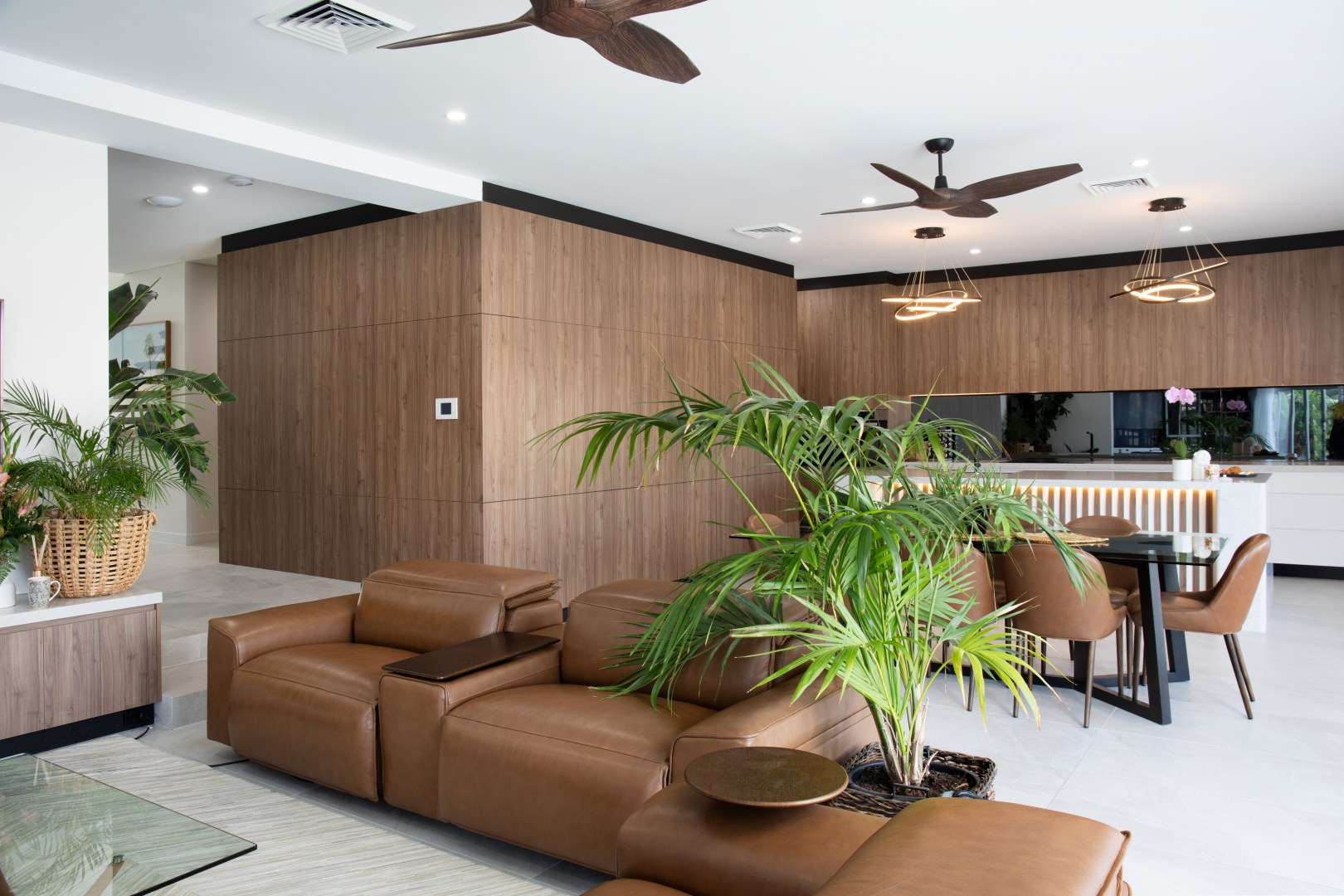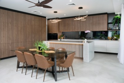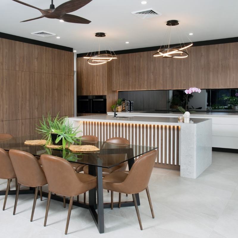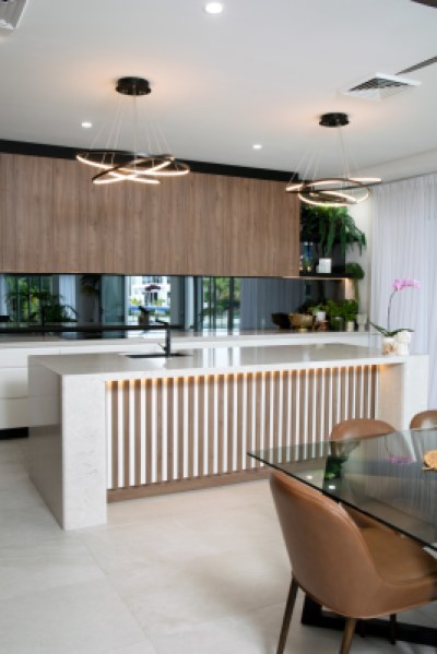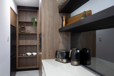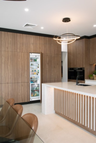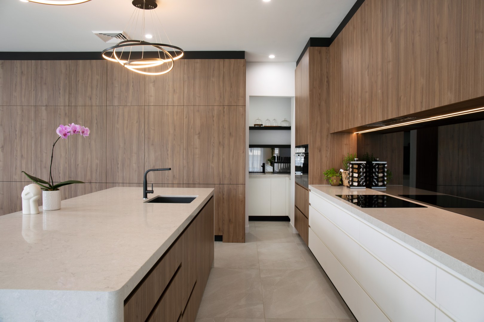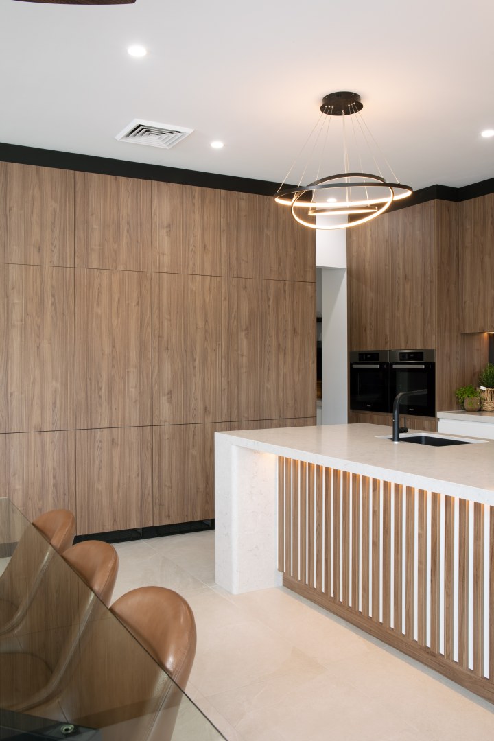 Experience the epitome of elegance and functionality with our recent cabinet renovation project. We transformed the kitchen, pantry, powder room (Black Woodmatt), and fireplace & TV unit with the luxurious polytec Notaio Walnut Woodmatt finish. The centerpiece is a spacious stone island, boasting gentle curves and adorned with feature battens in polytec Notaio Walnut Woodmatt, adding depth and character to the space. Get ready to indulge in a harmonious blend of bold design and practicality.