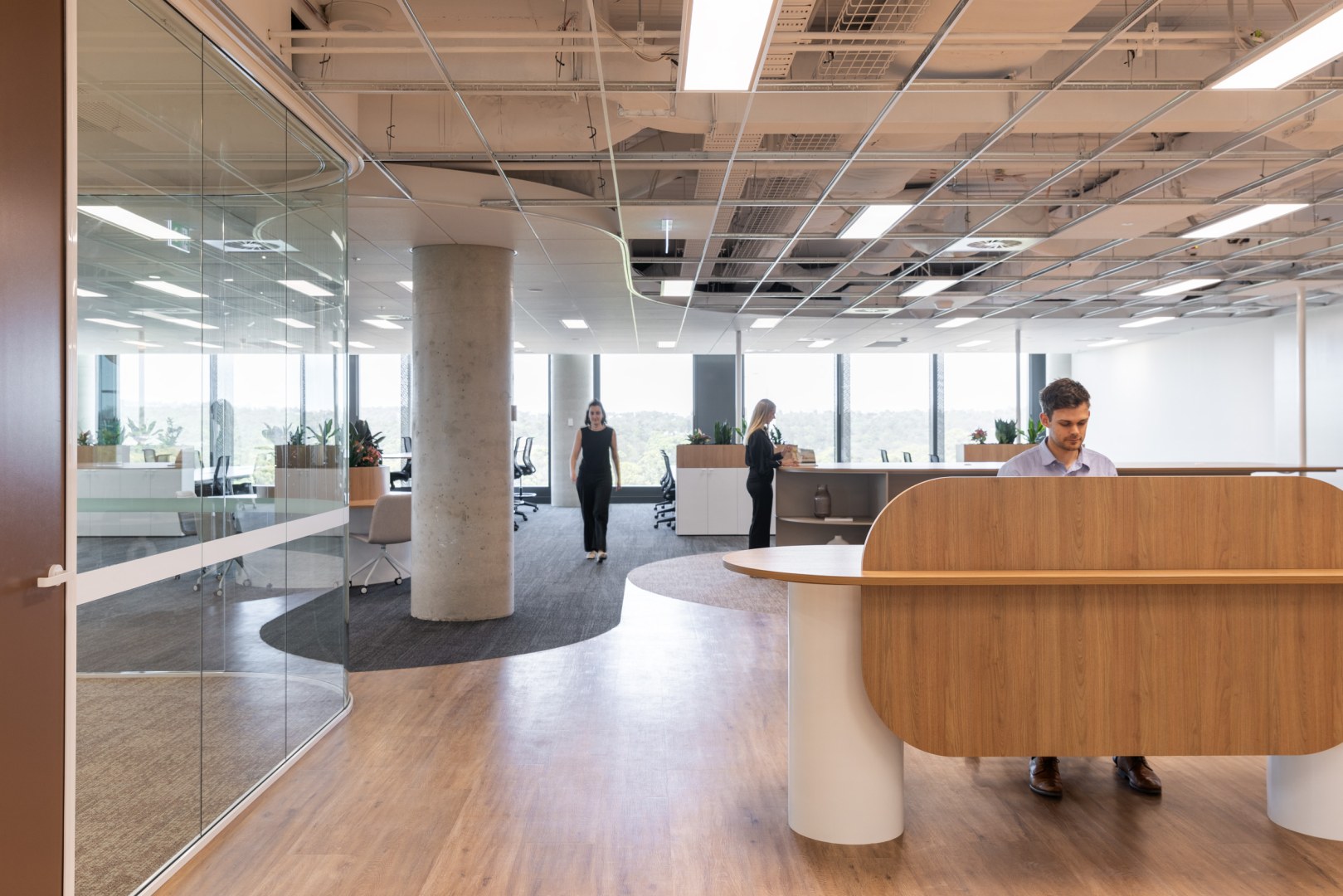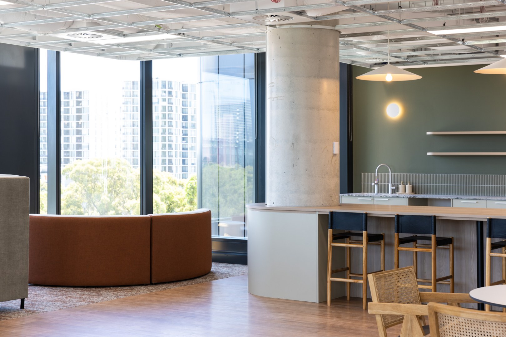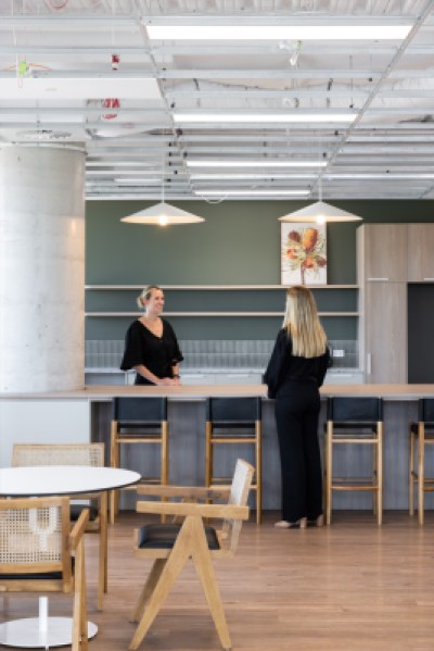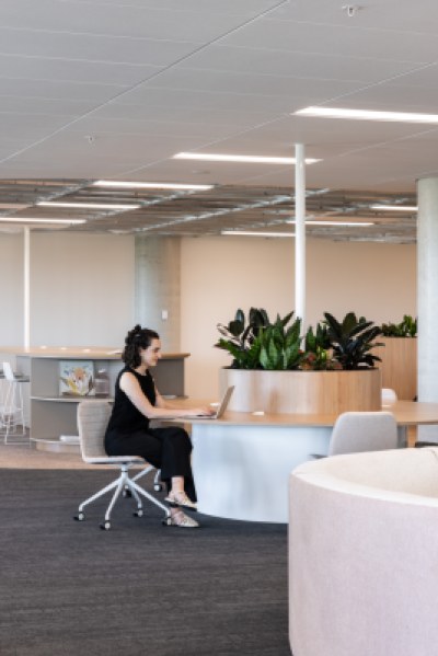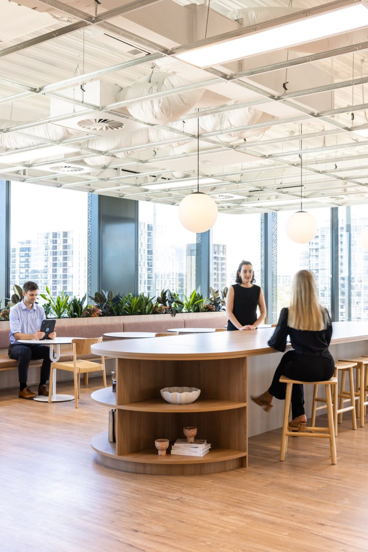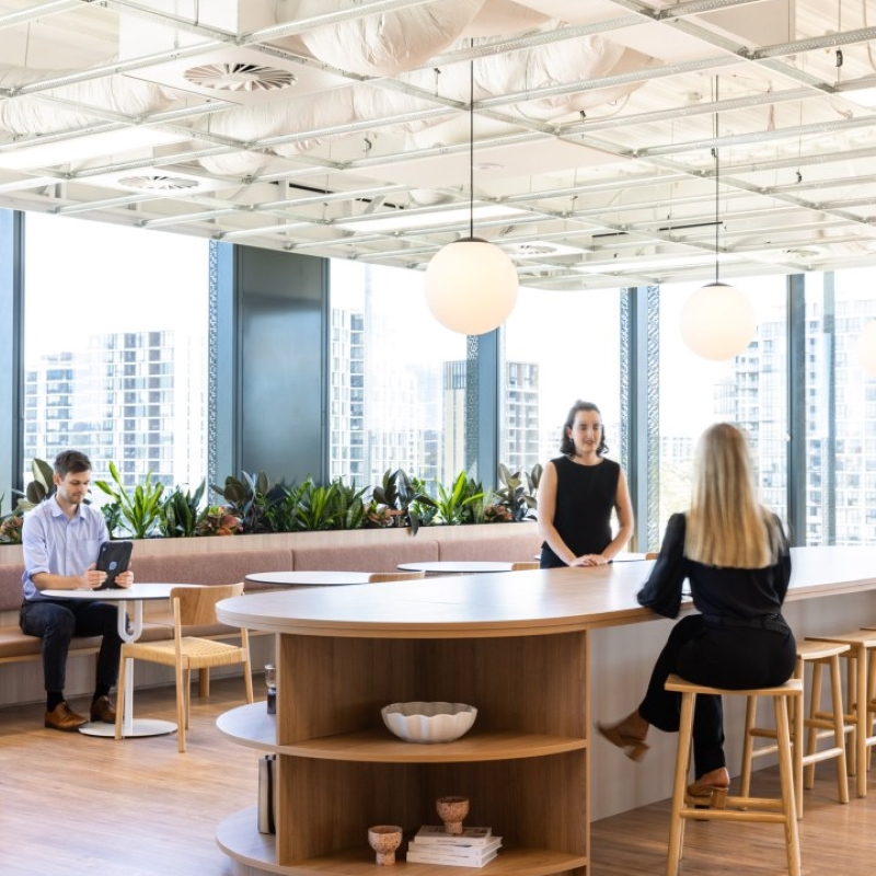 Sheldon completed five speculative suites across two floors in Macquarie Park. These workspaces highlight the value of office space and speculative suites in this expanding business hub in northern Sydney. Sheldon joinery is used to its full potential, including the reception desks in different styles, kitchen joinery and seating with inbuilt planter boxes, and round collaboration tables. These timeless styles ensure that the spaces will suit a wide range of tenants.