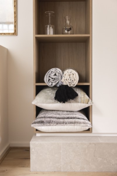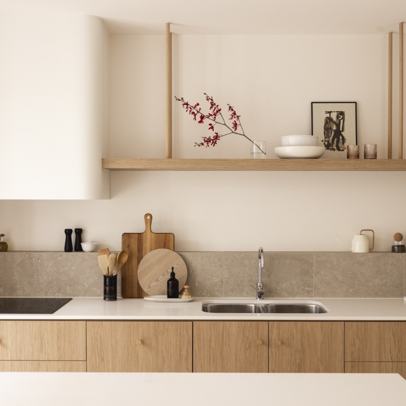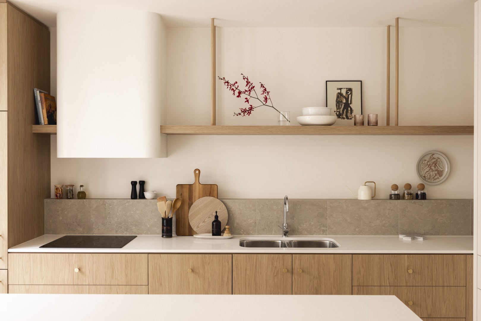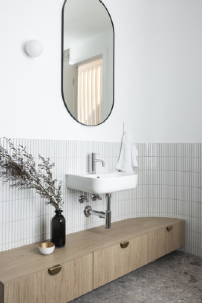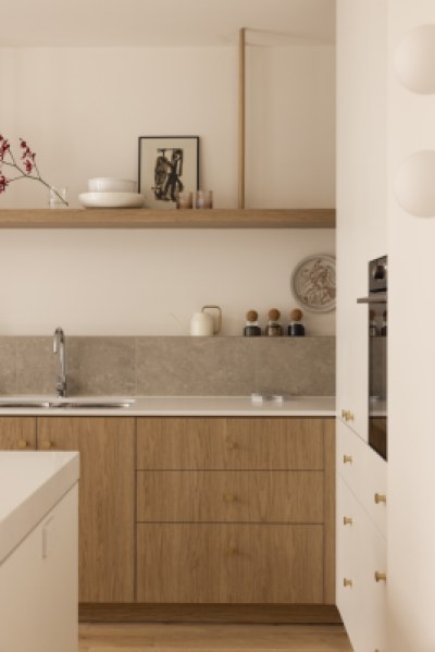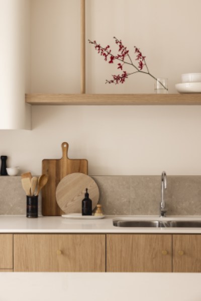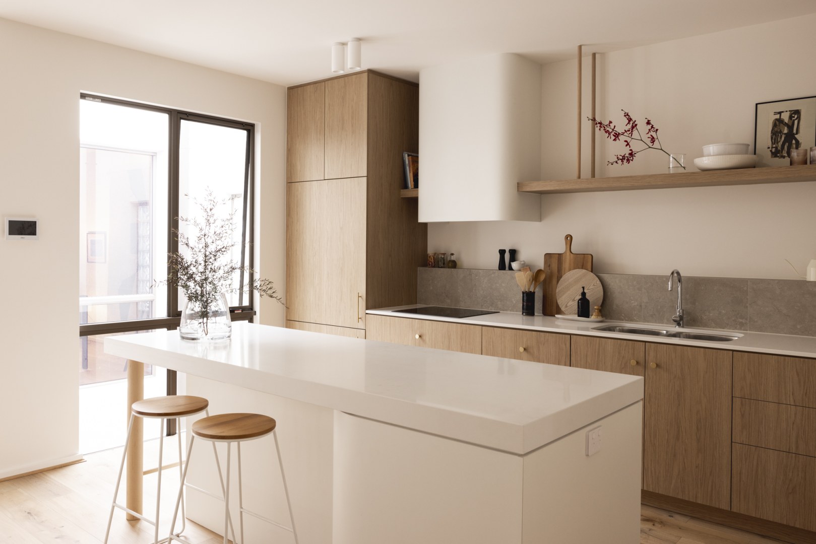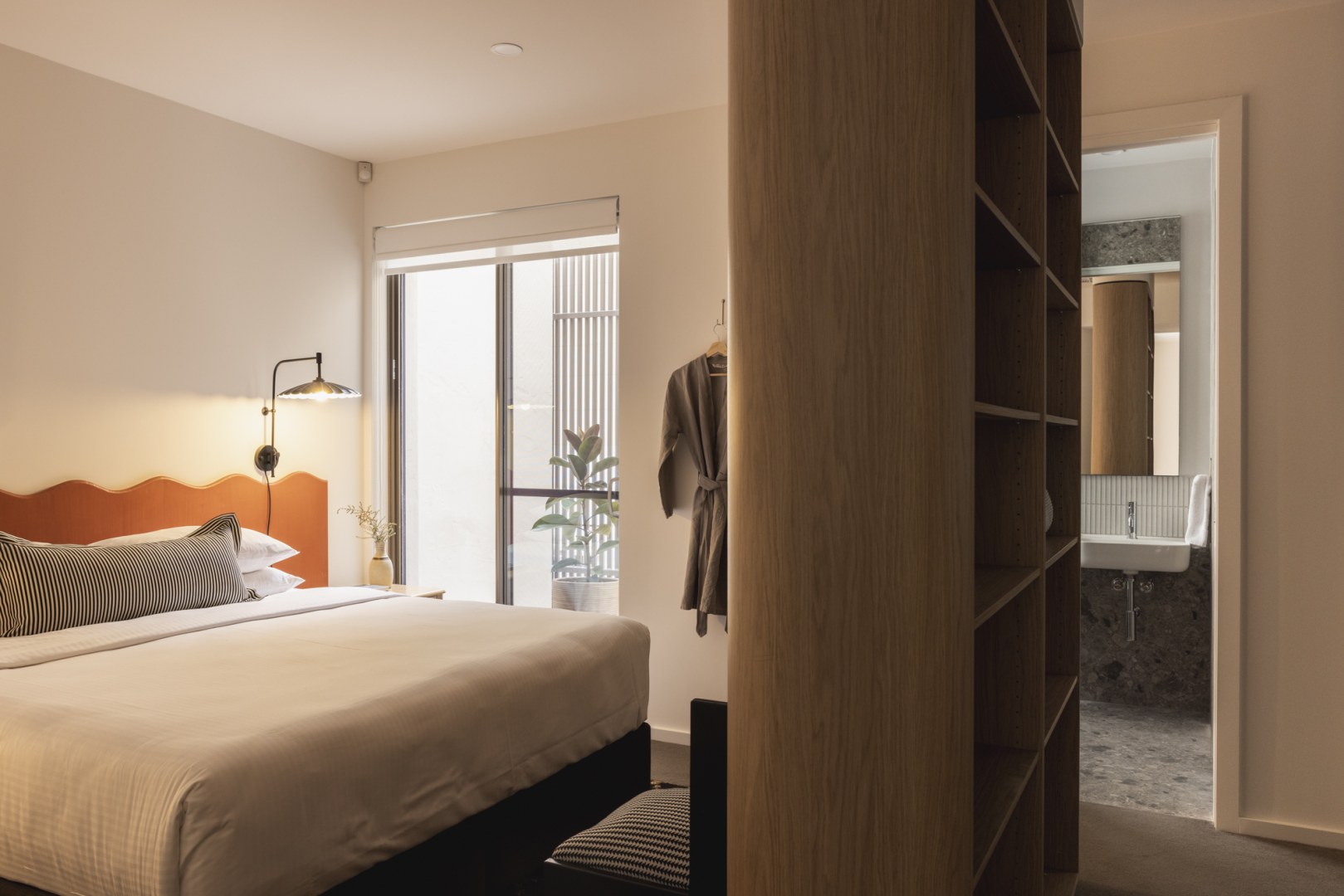 Studio Loft Co. is a creative escape in Nth Adelaide, designed to bring joy to whoever resides there. Tucked between history and manicured streets, it summons memories of European adventures. This short-term accommodation features unique design elements for a special experience. A standout is the Boston Oak Woodmatt joinery element with curved ends, serving as a room divider in the master bedroom, creating two distinct zones and offering a clever use of space.