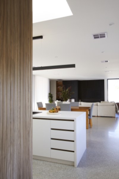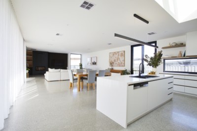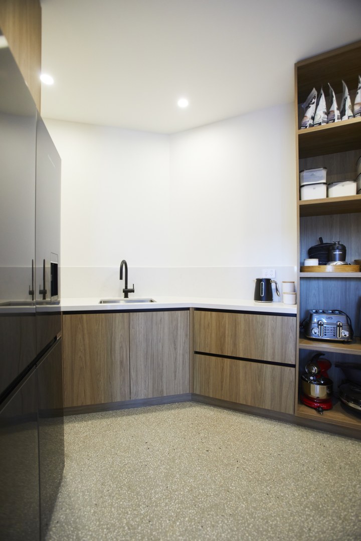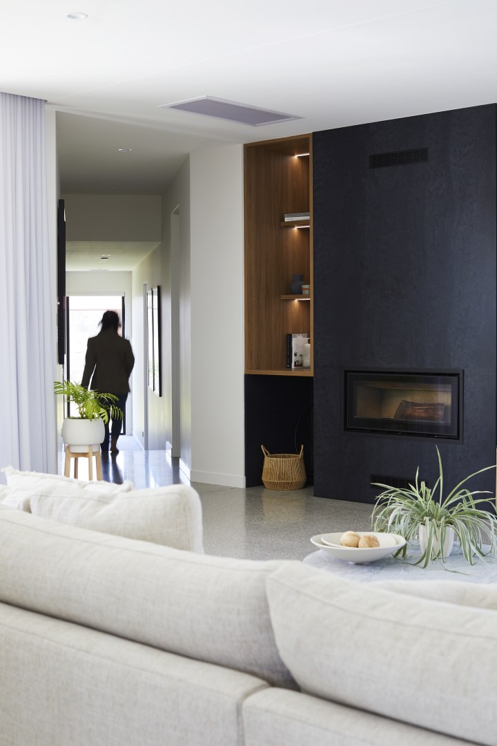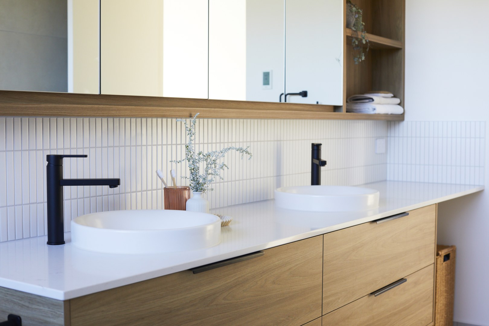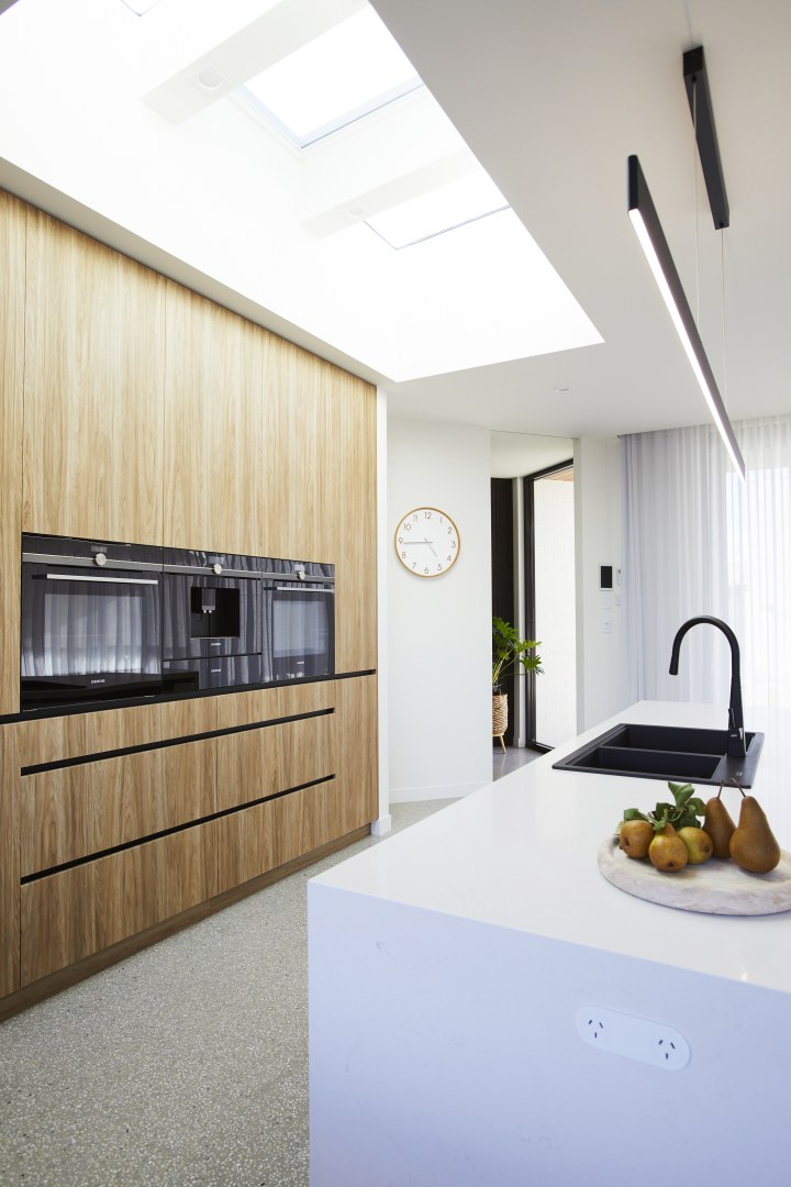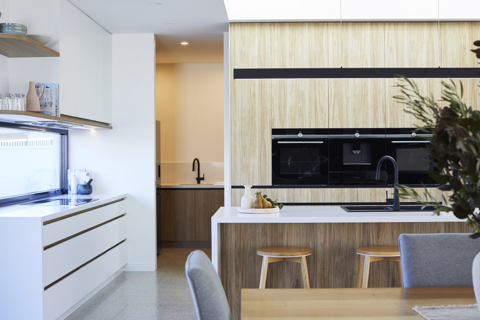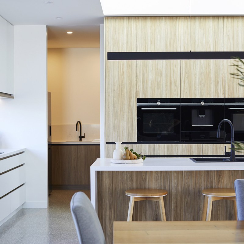 This architecturally designed home honours modern architecture with its unique use of dynamic angles, standing as a testament to innovative design and meticulous craftsmanship. Internally, we designed custom joinery that integrates a thoughtfully specified palette of Prime Oak, Blossom White and accents of matte black to add warmth and texture. The harmonious blend of materials and colours creates a cohesive and visually striking interior, whilst maintaining the home's contemporary aesthetic.
