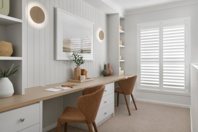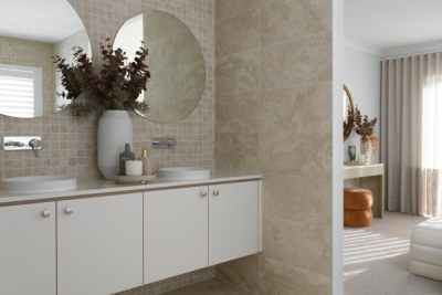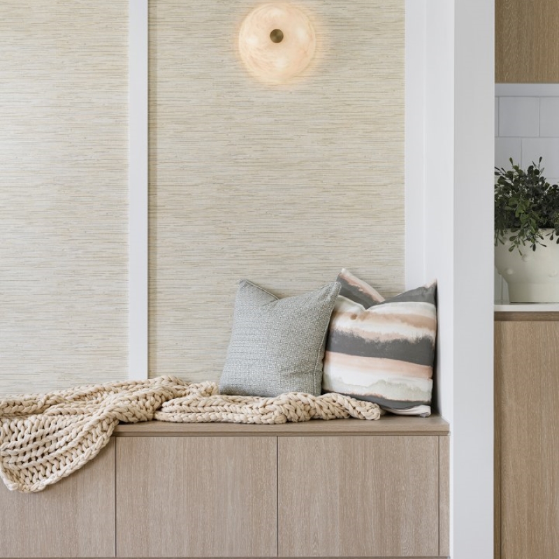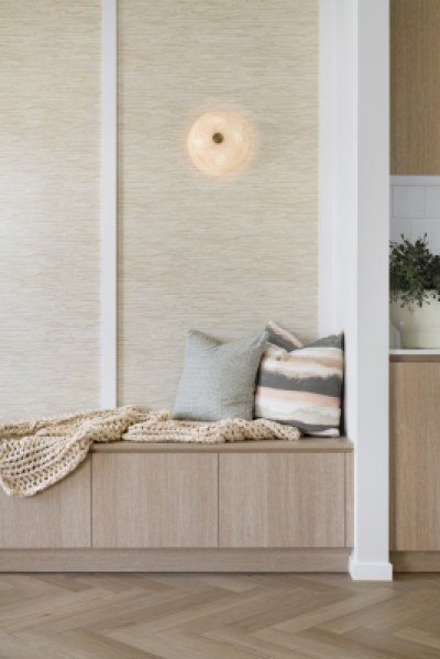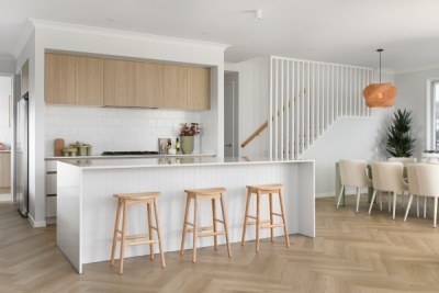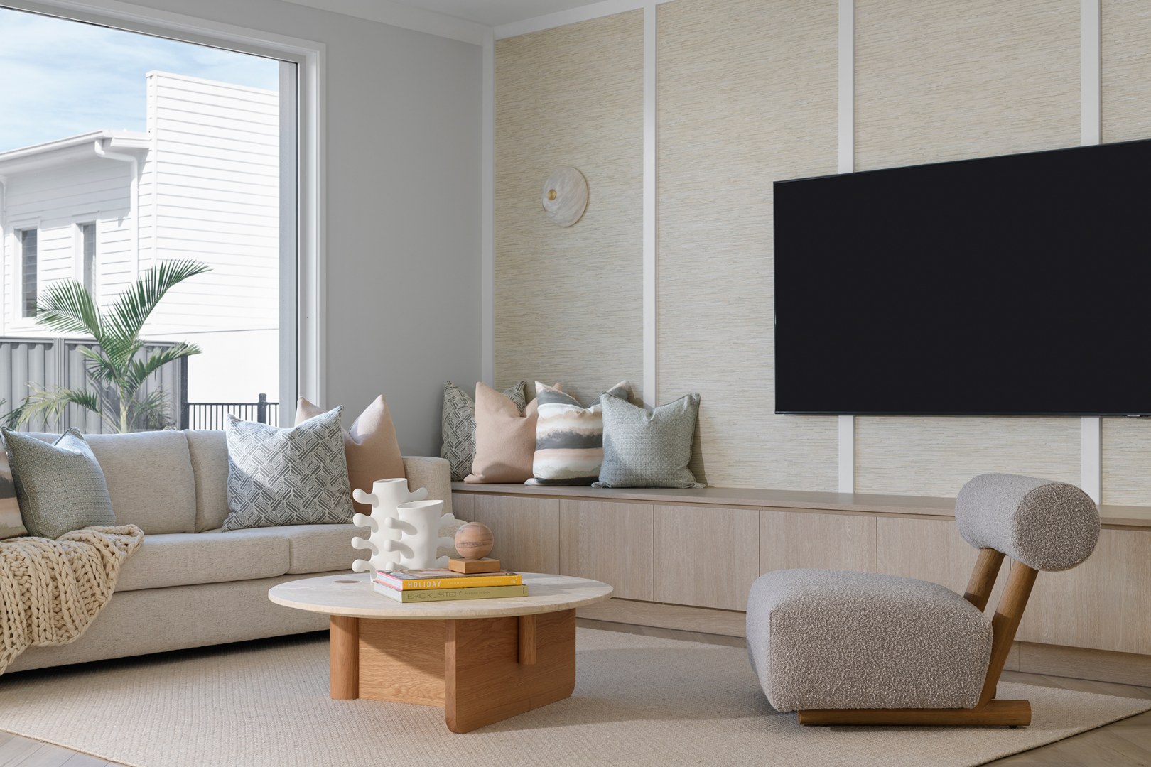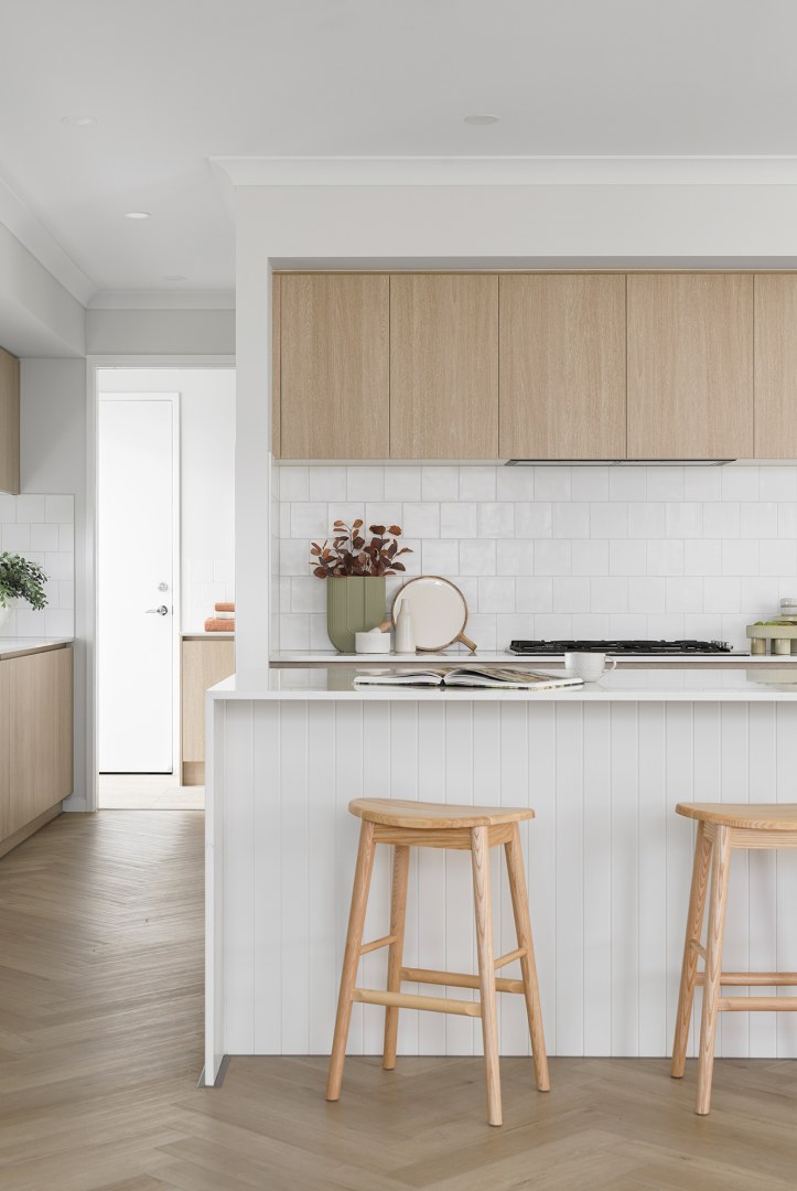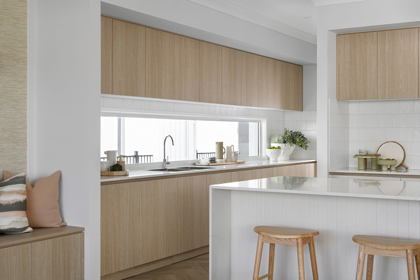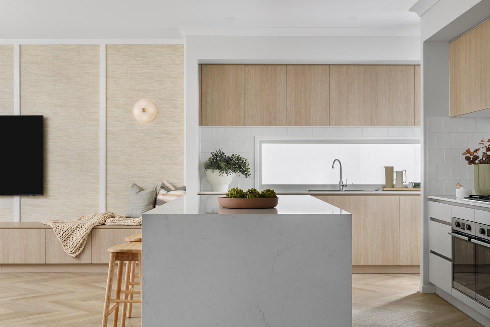 In this contemporary home with Mediterranean and Scandinavian influences merge, crafting a relaxed yet refined coastal ambience. Dreamy travertines and tactile whites, paired with limewashed oaks, evoke barefoot luxury. Rattans, terracotta, and sage greens punctuate the neutral interior, while cleverly highlighted shadowline detailing and playful edge tape accents can be found throughout. Functional joinery including study, storage and bench seating reflects a modern simplicity and practical family living.
