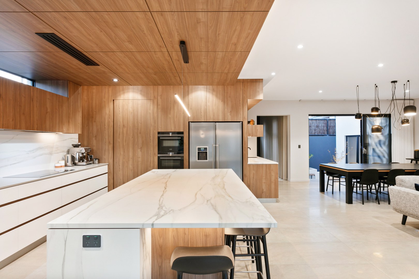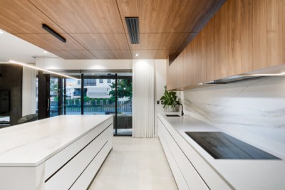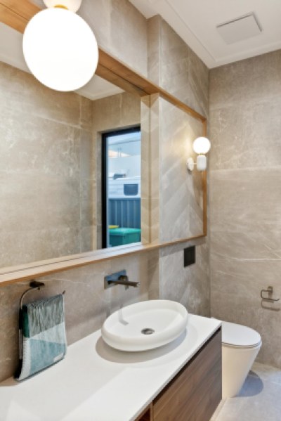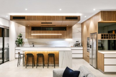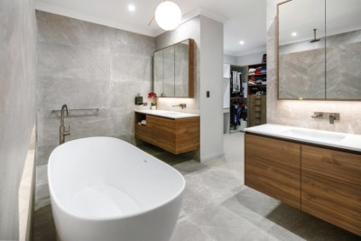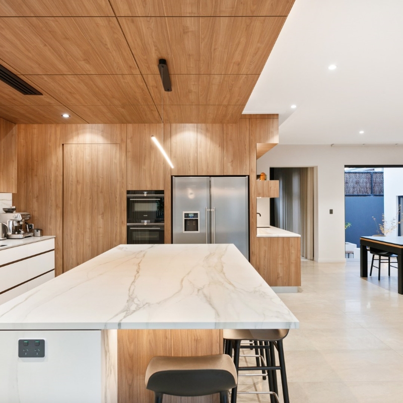 Just a stone’s throw away from the Swan River, this home has been designed to take in the sweeping views of the river at the streets end. This project is the ultimate entertainer but still has the comforts and function of the perfect family home, featuring 4 beds, 2 and a half baths, theatre, and a study. This home has a modern palette with modern tiling selections and layouts, timber and stone cladding featuring throughout.