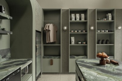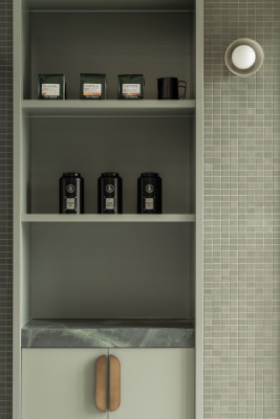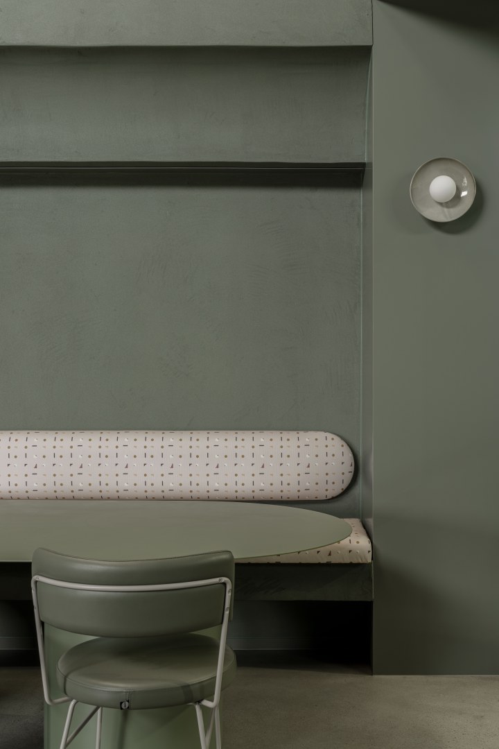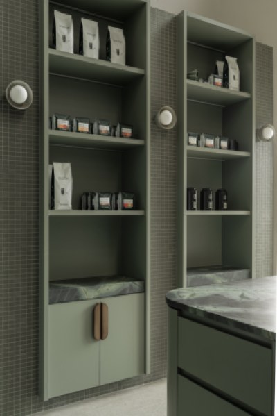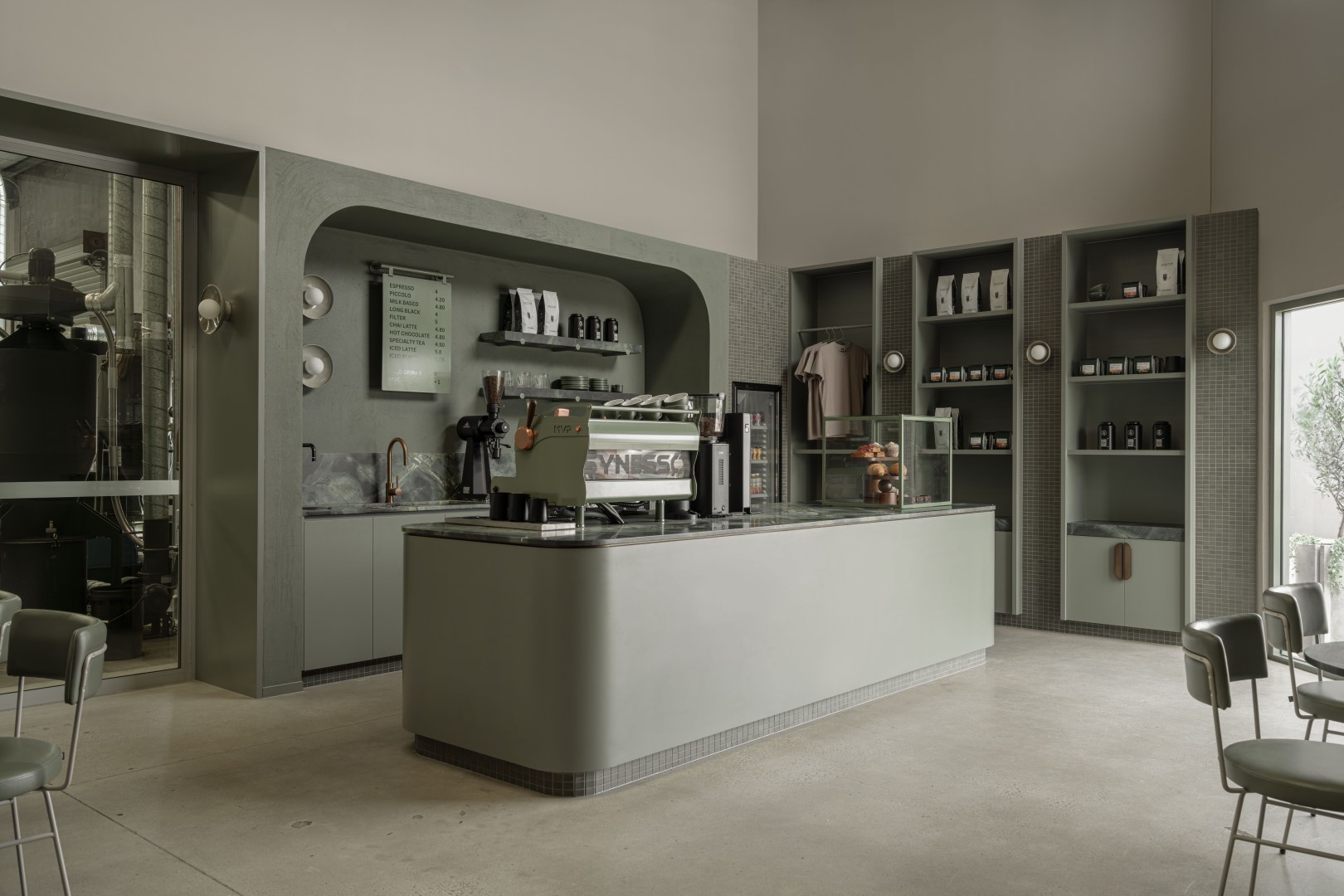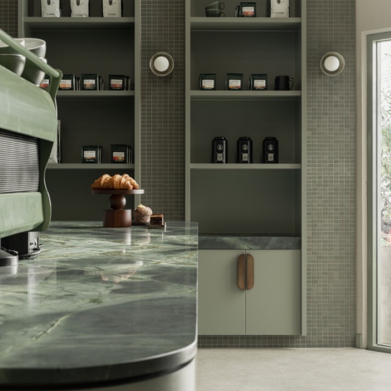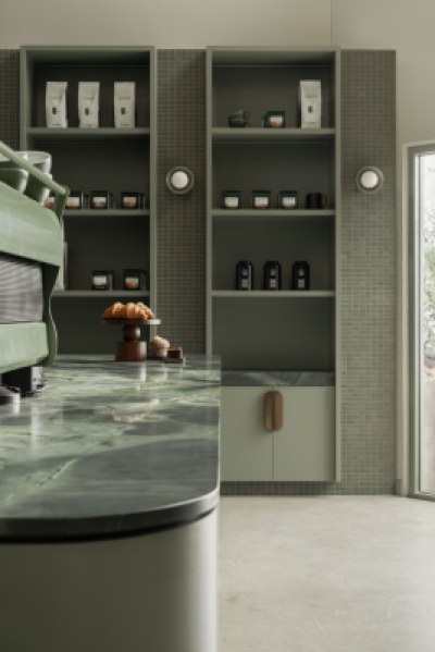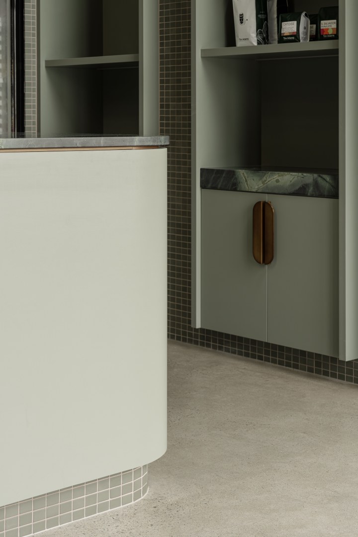 An espresso bar that overlooks the roasting facilities, offering patrons a unique view into the coffee making process. The interior comprises of thoughtful layering of textures and materials. From render textures to natural stone patterns, the material selections elevate the space, creating an atmosphere of tranquillity and elegance. The use of Topiary for the joinery not only enhances the aesthetic appeal but also reinforces the cohesive colour palette and ties in seamlessly with the green theme.