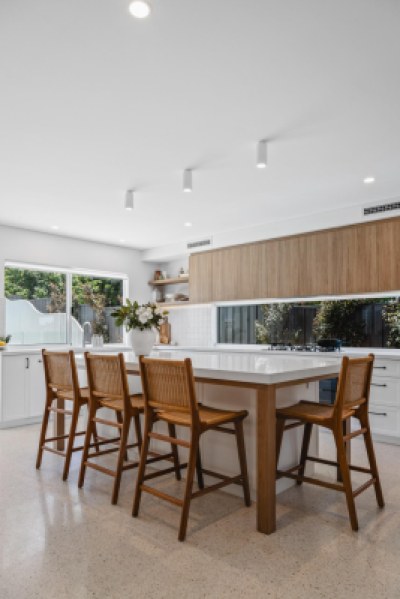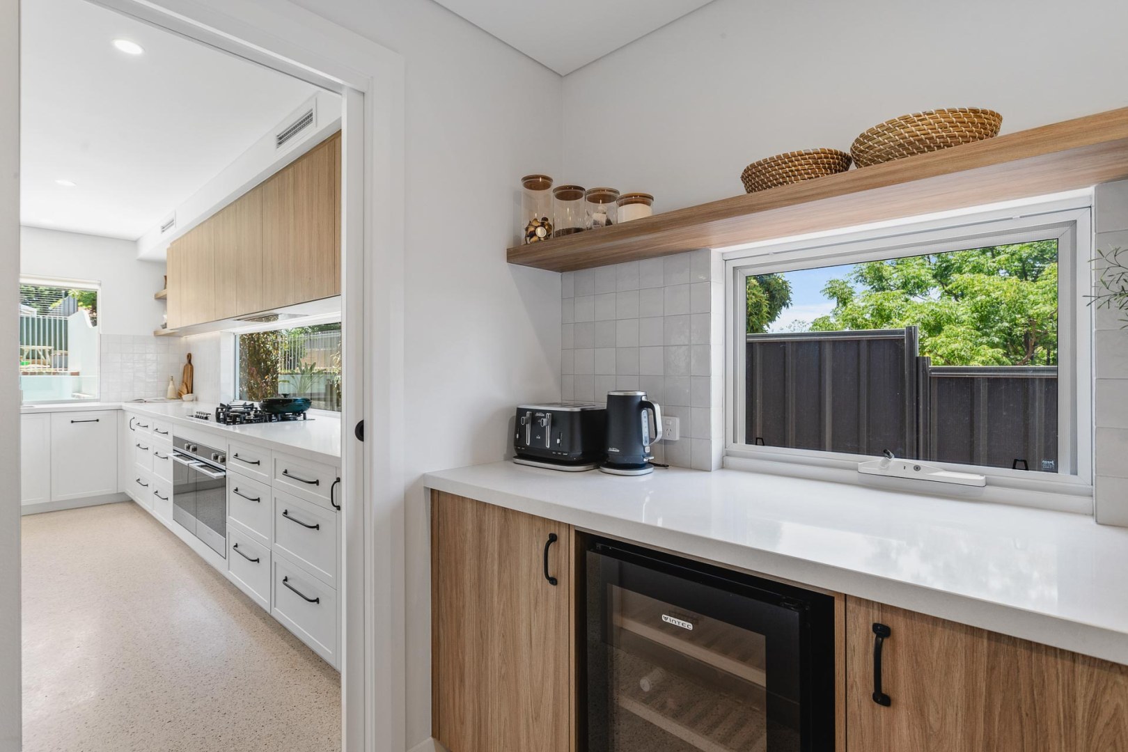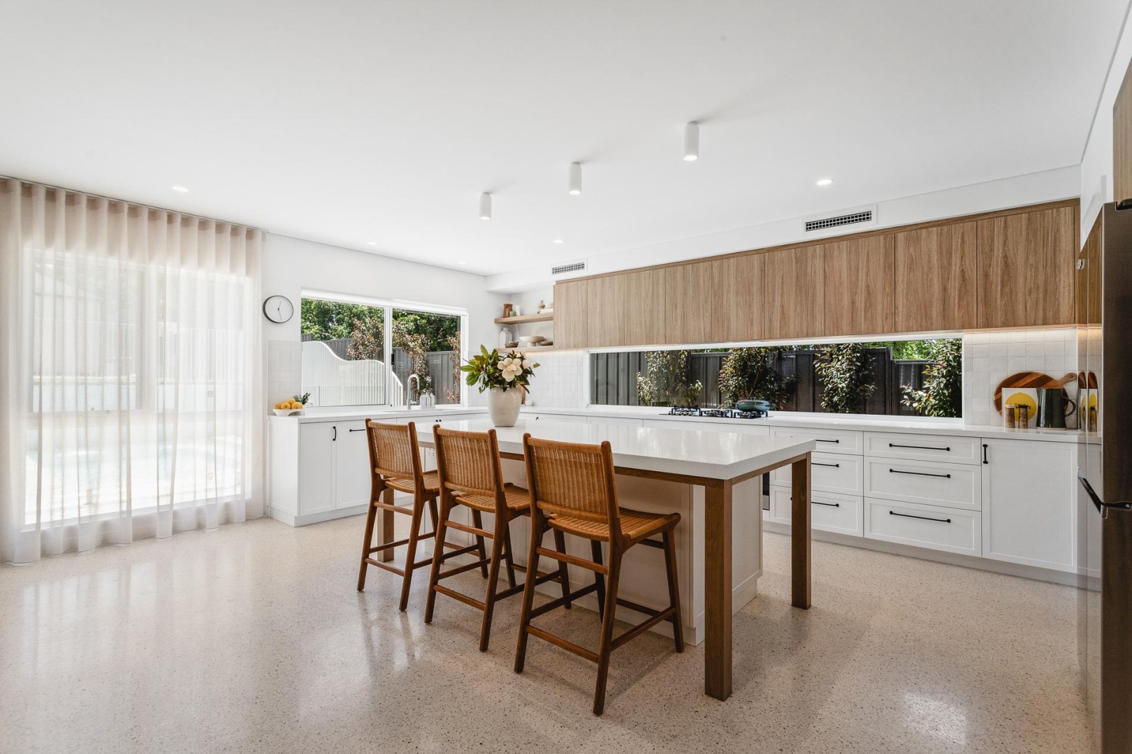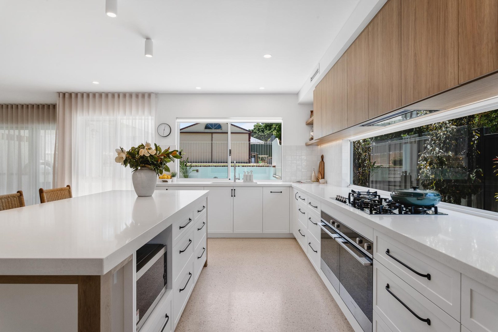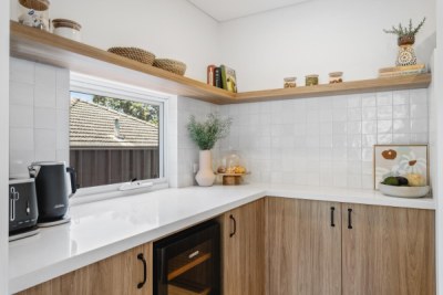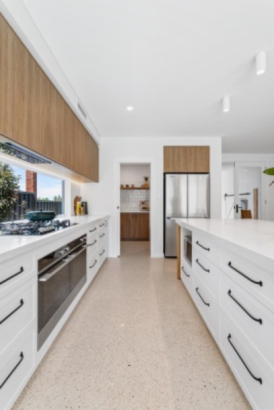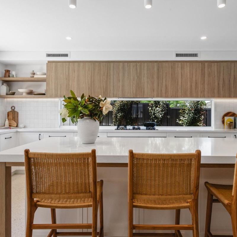 A stunning Modern Shaker style kitchen design that creates it's own style. polytec Ascot cabinetry in Classic White is paired with Prime Oak handleless overhead cupboards; and an asymmetrical open shelf feature to break up the run of overhead cabinetry. Black industrial style handles were used on the lower cabinetry as a feature and to tie in with other hardware throughout this home.