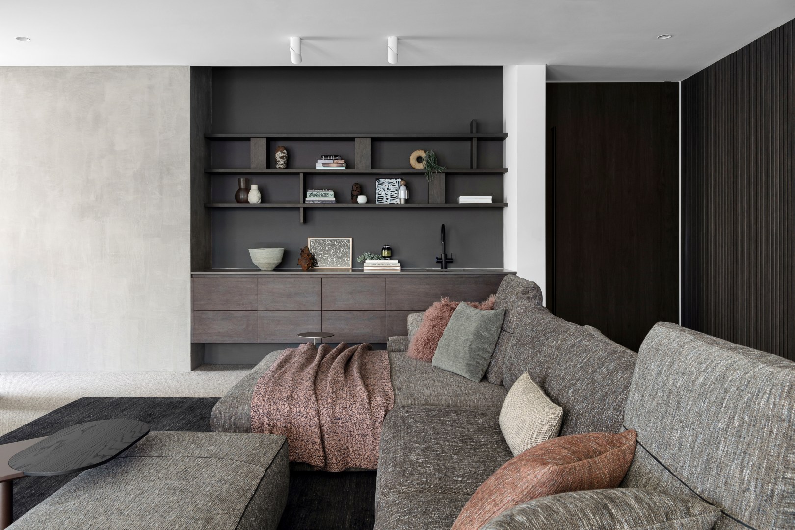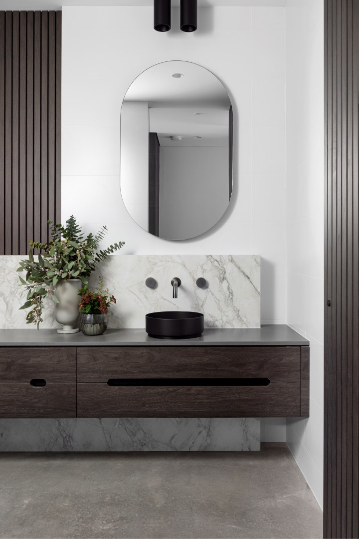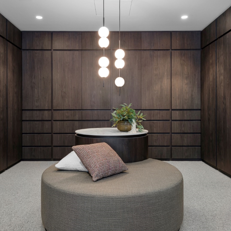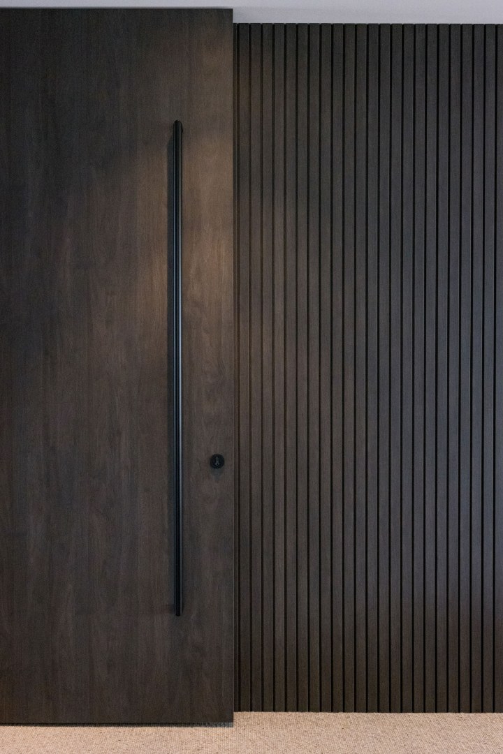 This project called for a family home with functionality and practicality at heart whilst leaning into a moody and luxurious style. Perugian Walnut Woodmatt cabinetry combined with porcelain surfaces creates a bold yet calm aesthetic, with Steccawood battening crafted throughout the home for added warmth and texture. An interplay of textures is seen throughout the home, with metallic elements juxtaposed with concrete and joinery components giving the residence a sense of continuity and elegance.