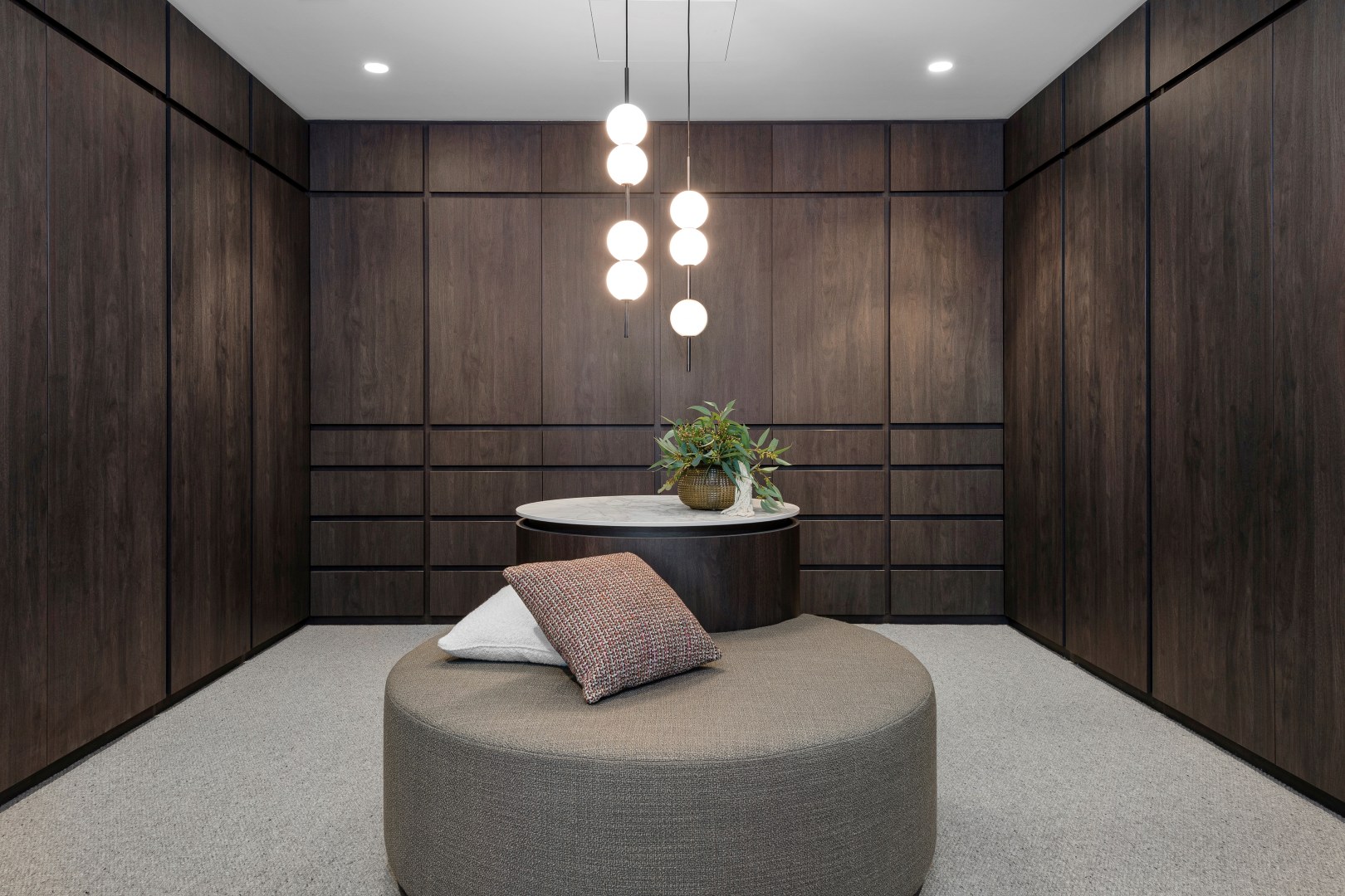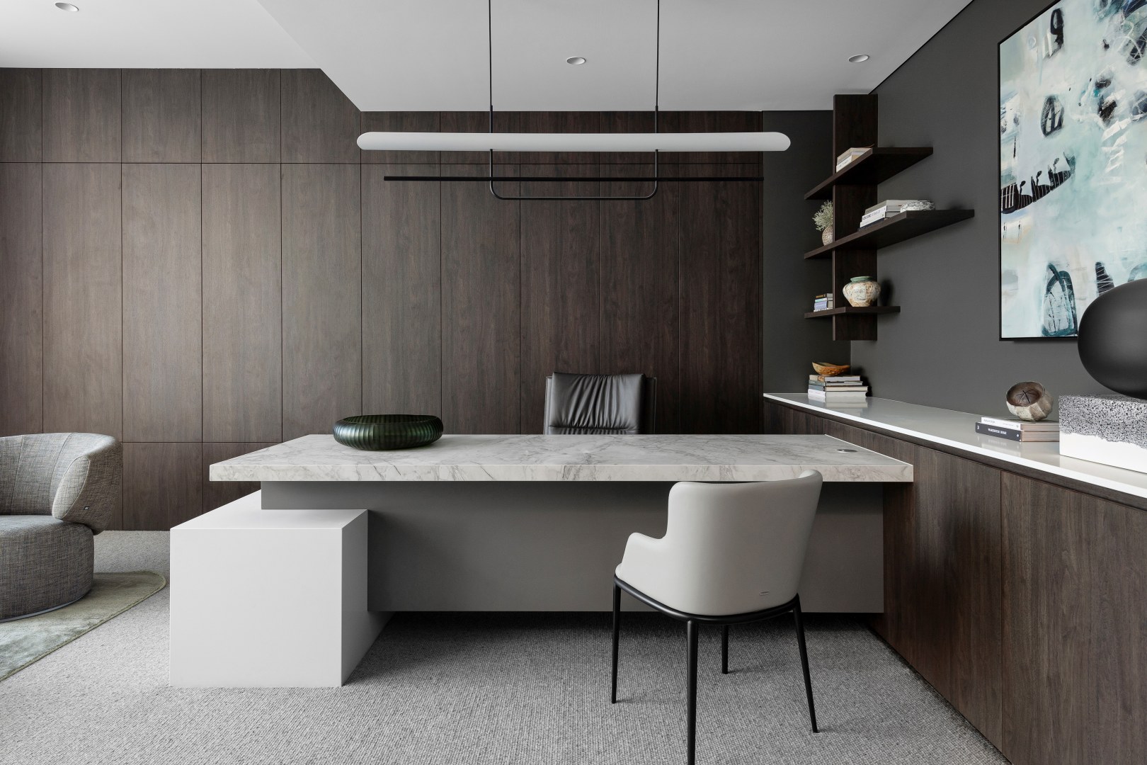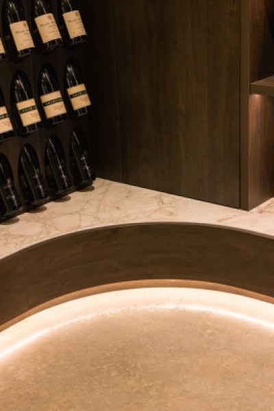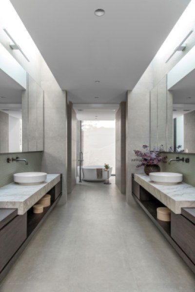 This project called for a family home with functionality and practicality at heart whilst leaning into a moody and luxurious style. Perugian Walnut Woodmatt cabinetry combined with porcelain surfaces creates a bold yet calm aesthetic, with Steccawood battening crafted throughout the home for added warmth and texture. An interplay of textures is seen throughout the home, with metallic elements juxtaposed with concrete and joinery components giving the residence a sense of continuity and elegance.