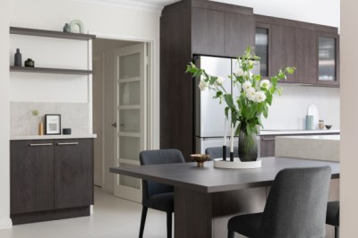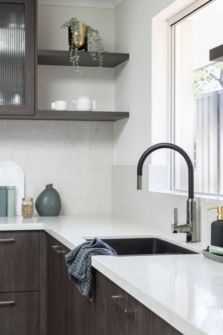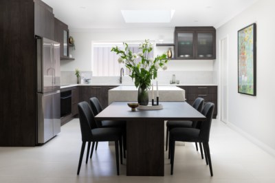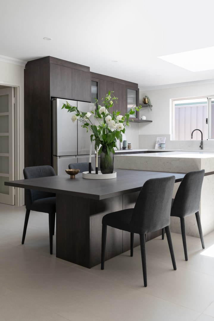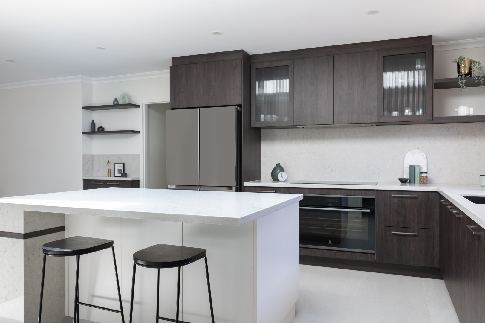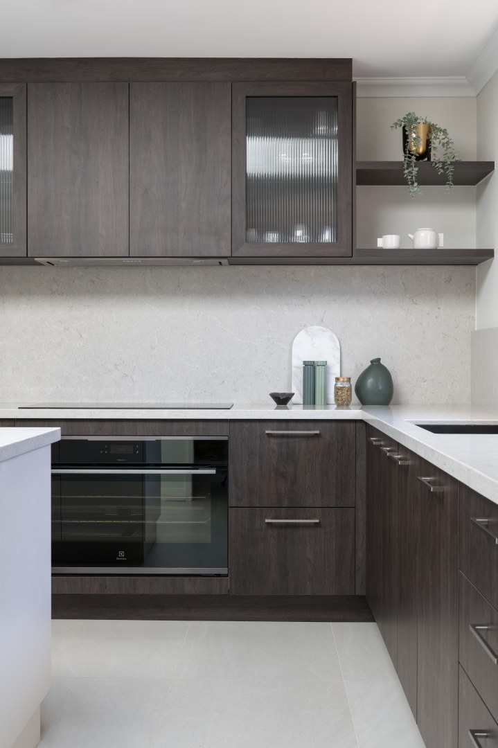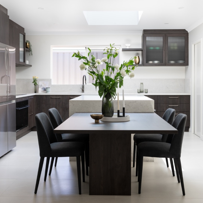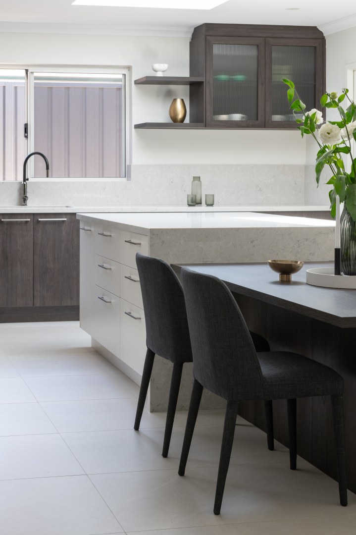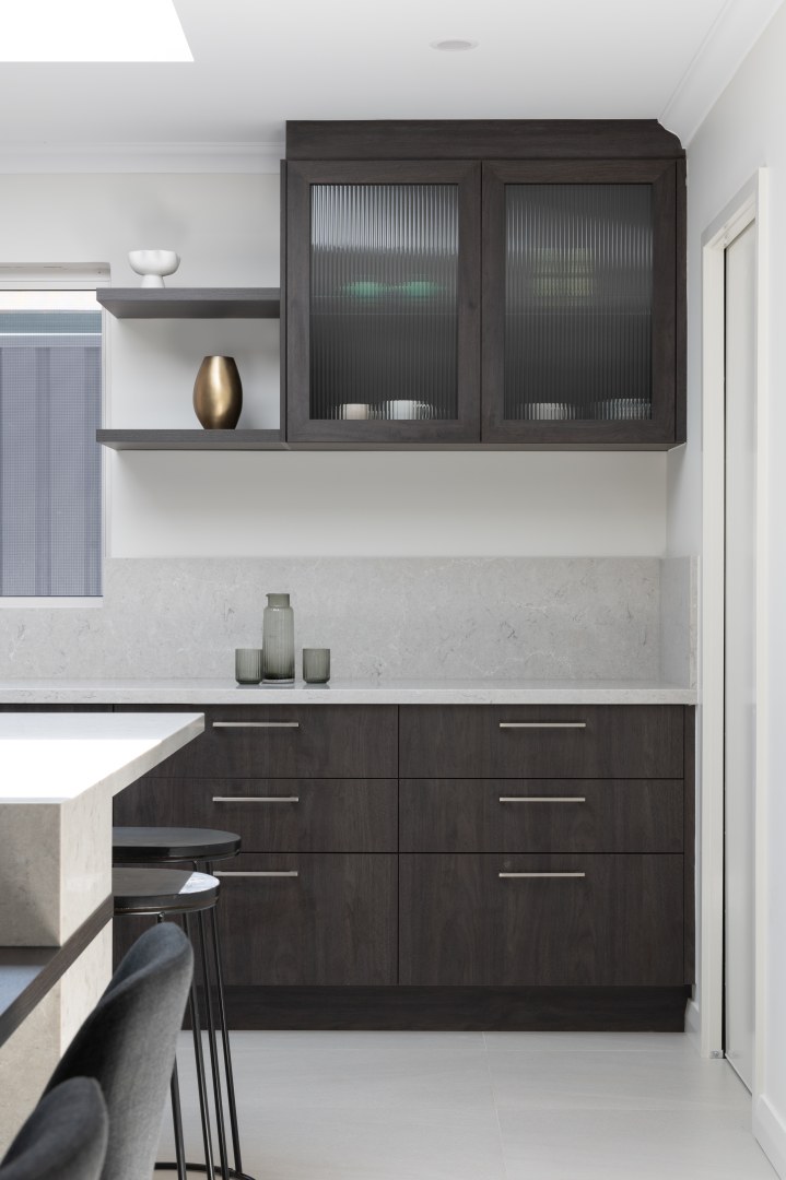 This Client approached us to redesign their dated kitchen, with a brief for multi-use zones, functional layout and modern design elements. A layered Island, incorporating a dining table, Fluted Glass and a bold colour palette including polytec Perugian Walnut, contrasts beautifully to the neutral floors, benchtop, splashback & polytec Alabaster Matt cabinetry specified on the Island. Additional feature shelving and storage integrate the Kitchen seamlessly to the adjacent areas of the house.