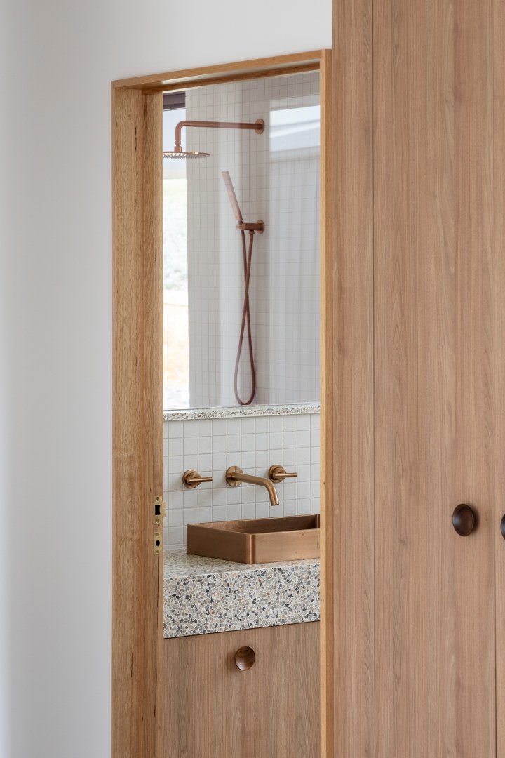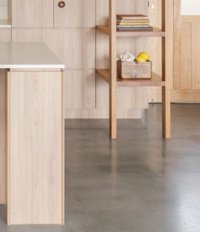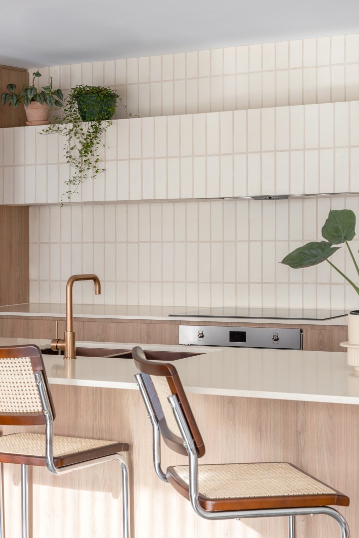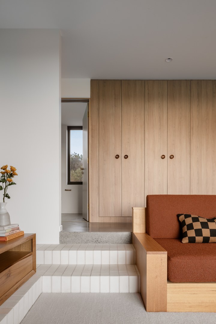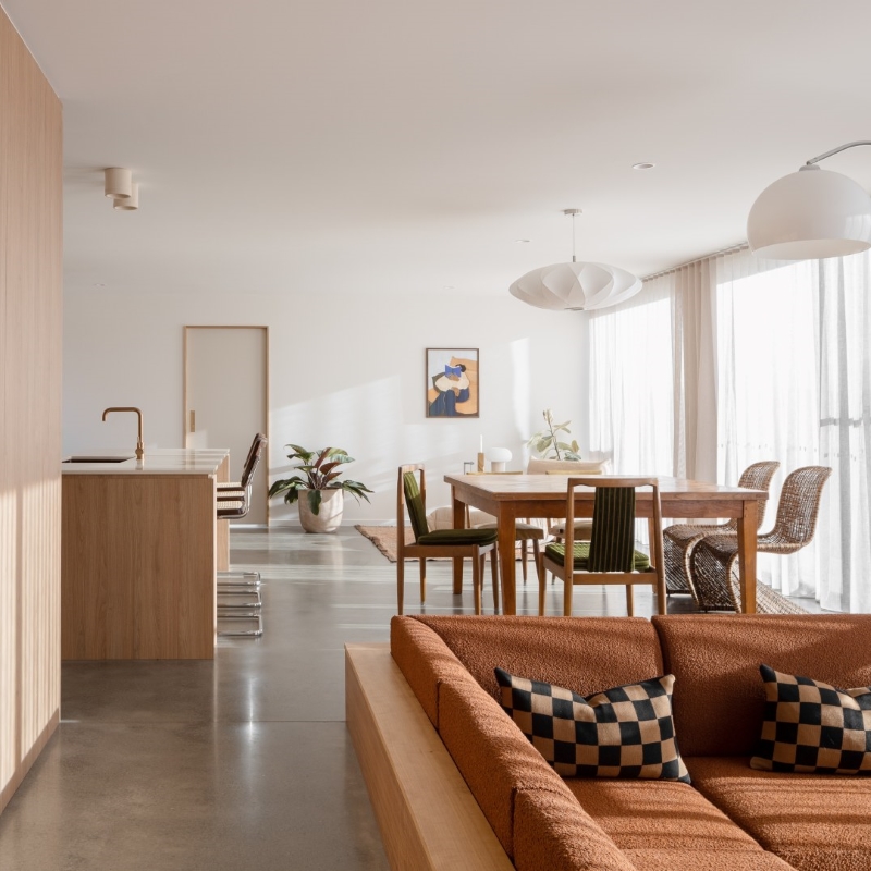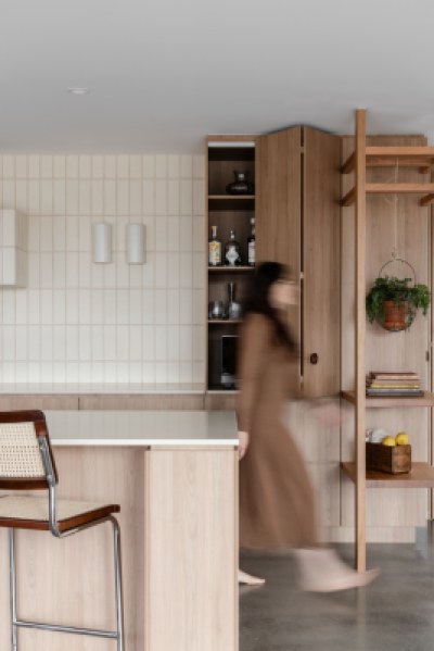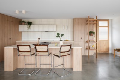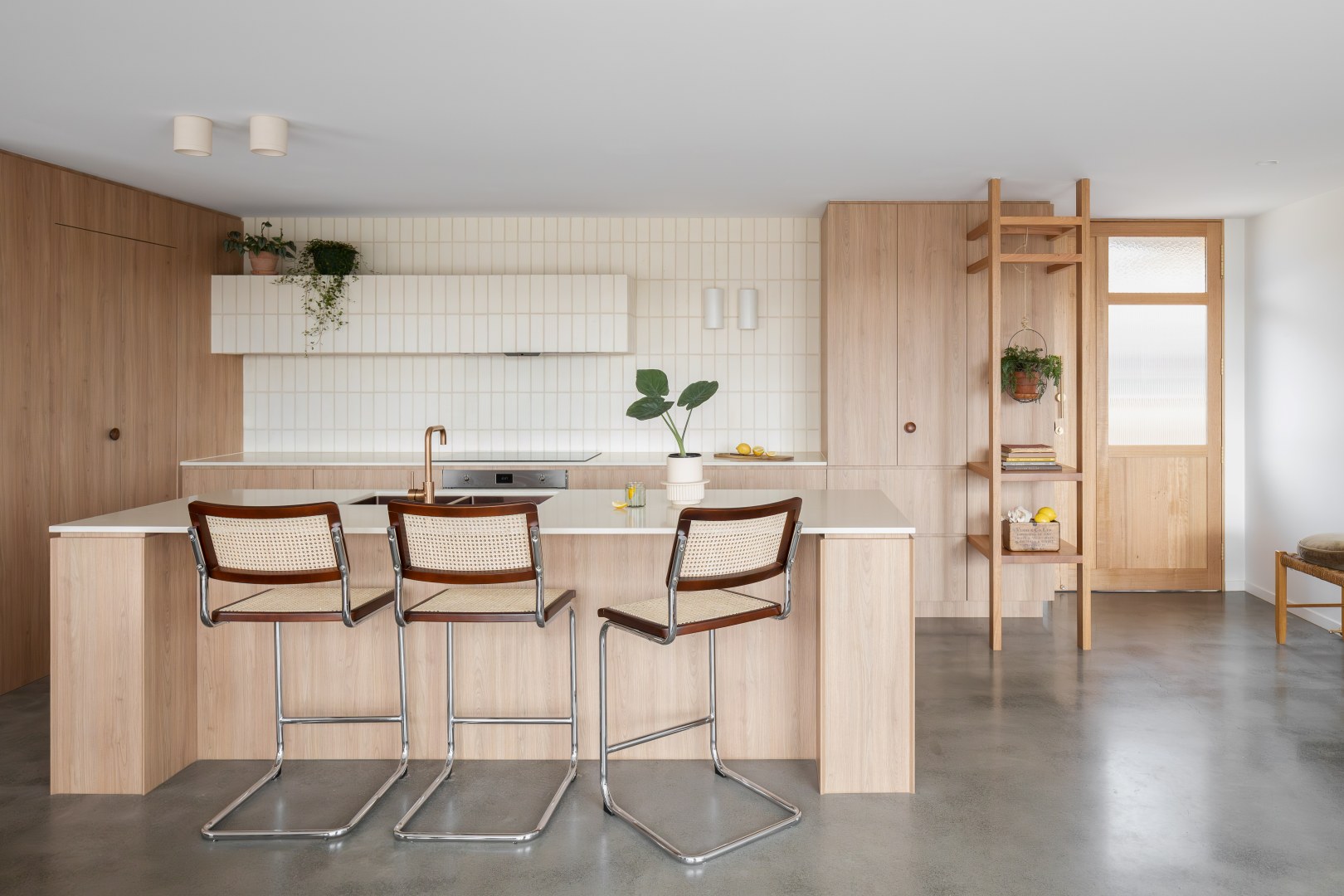 Nestled in Sorell's Tasmanian countryside, the home marries simplicity with personality. This family abode boasts a sunken lounge and floor to ceiling windows, flooding interiors with sunlight year round. Drawing inspiration from Mid Century Modern design and the local colour palette, we've seamlessly blended solid Tasmanian Oak timbers with polytec Tasmanian Oak Woodmatt, crafting an inviting, warm space that celebrates our surroundings.