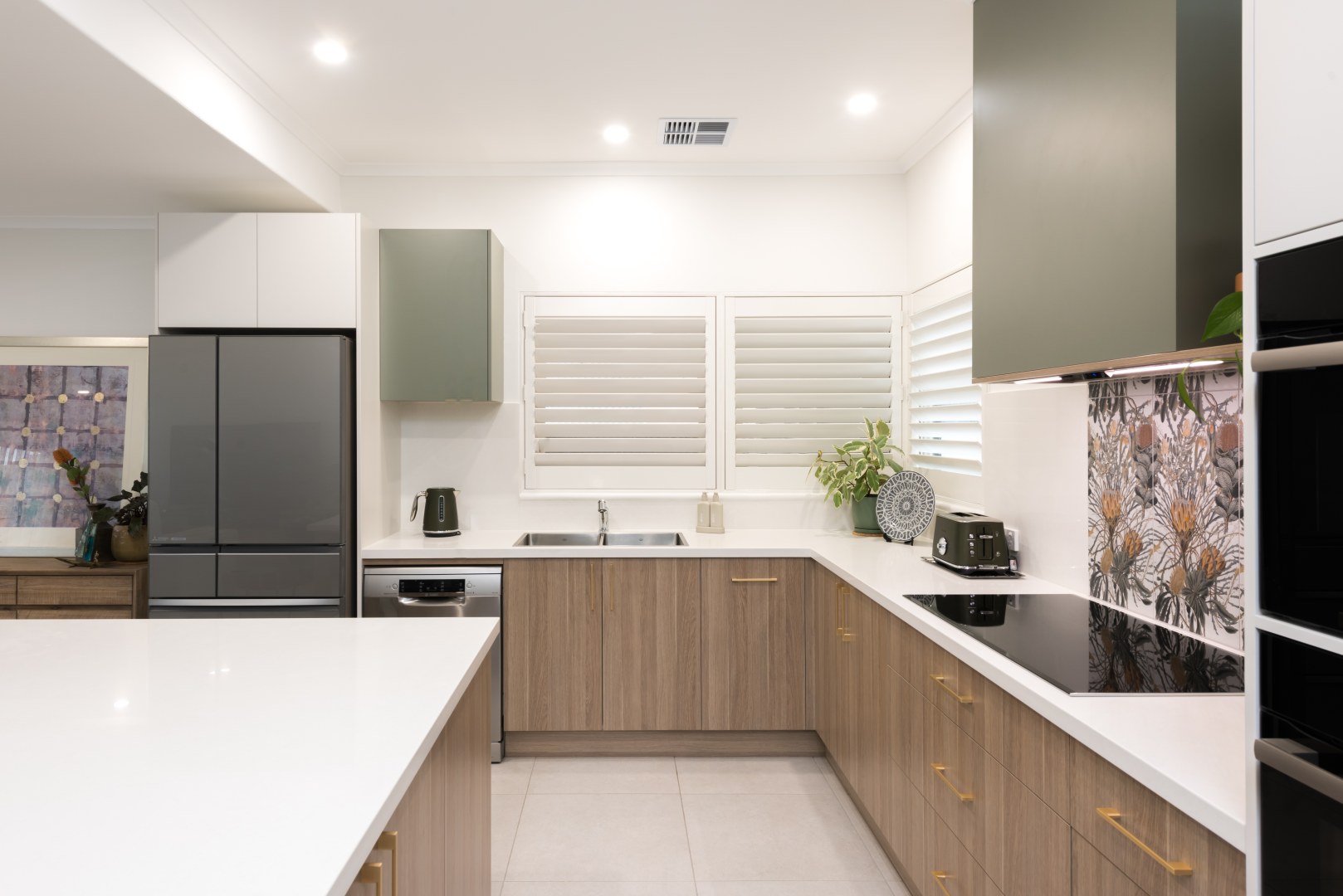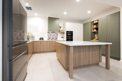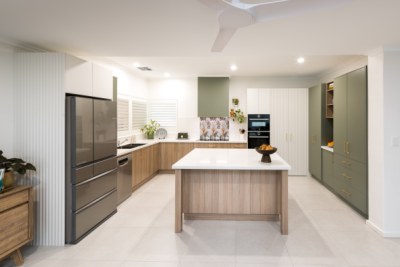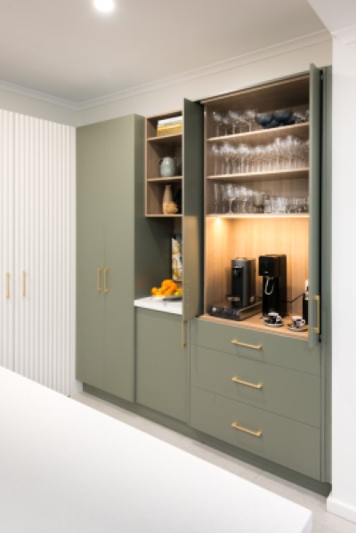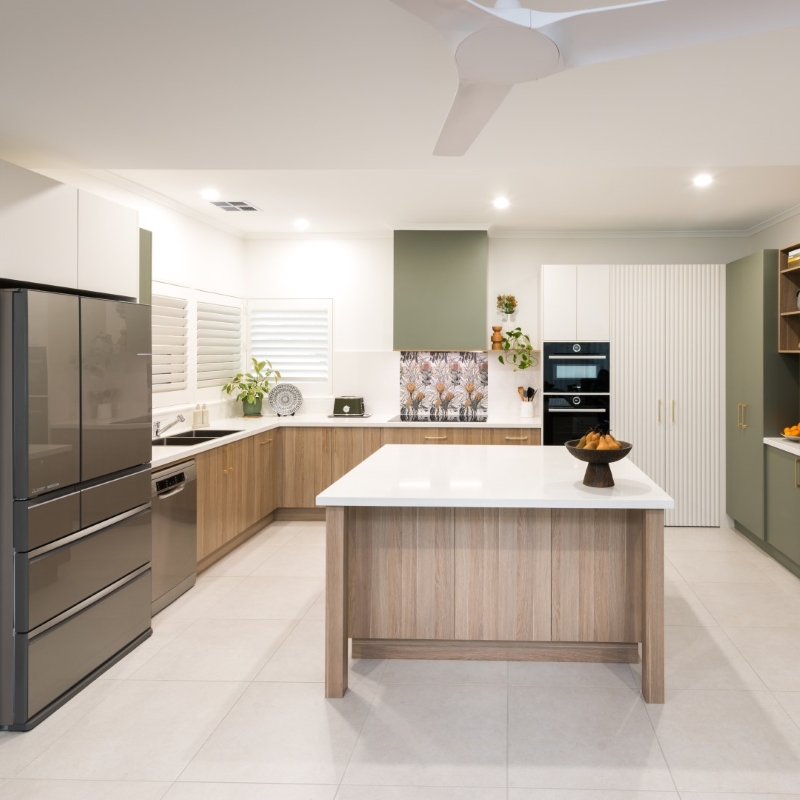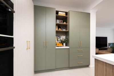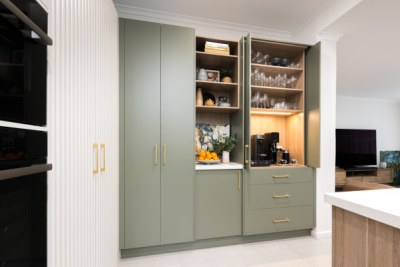 The brief for this renovation was to create a light, airy, interesting congregation space. The three colours chosen work harmoniously to this end whilst also complementing each other in a cohesive finished product. With floor to ceiling windows spanning the wall opposite this kitchen, the colour palette chosen reflected nature. Each colour providing a different element to the other which has created the perfect balance for the home.