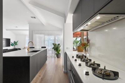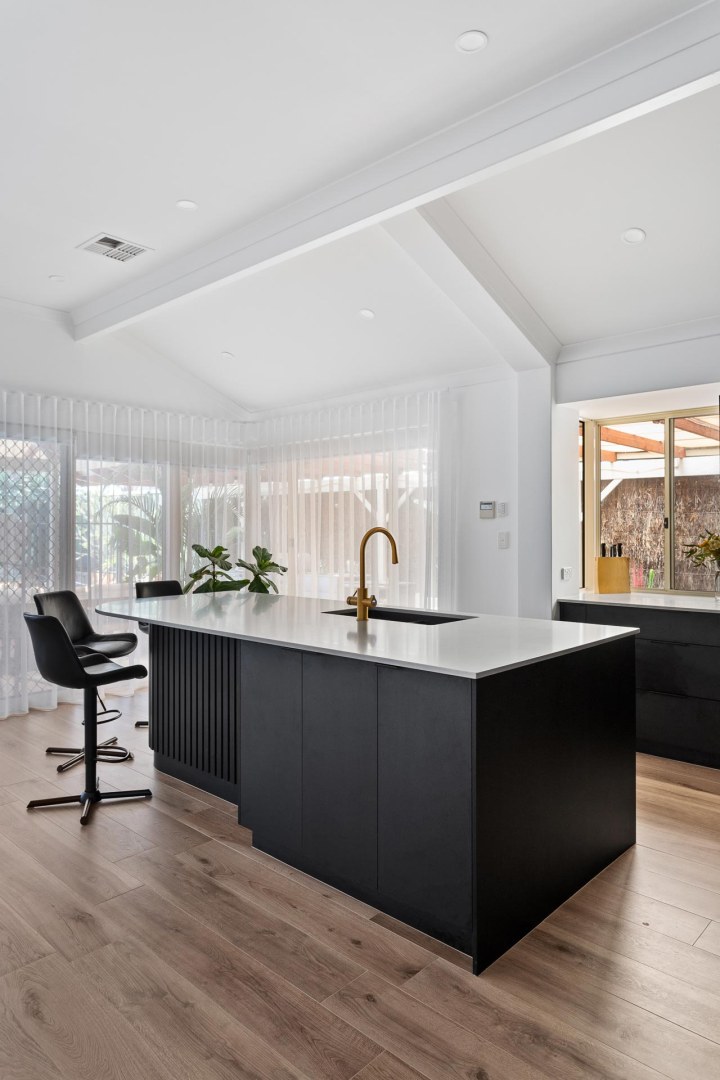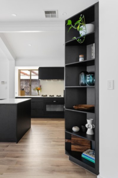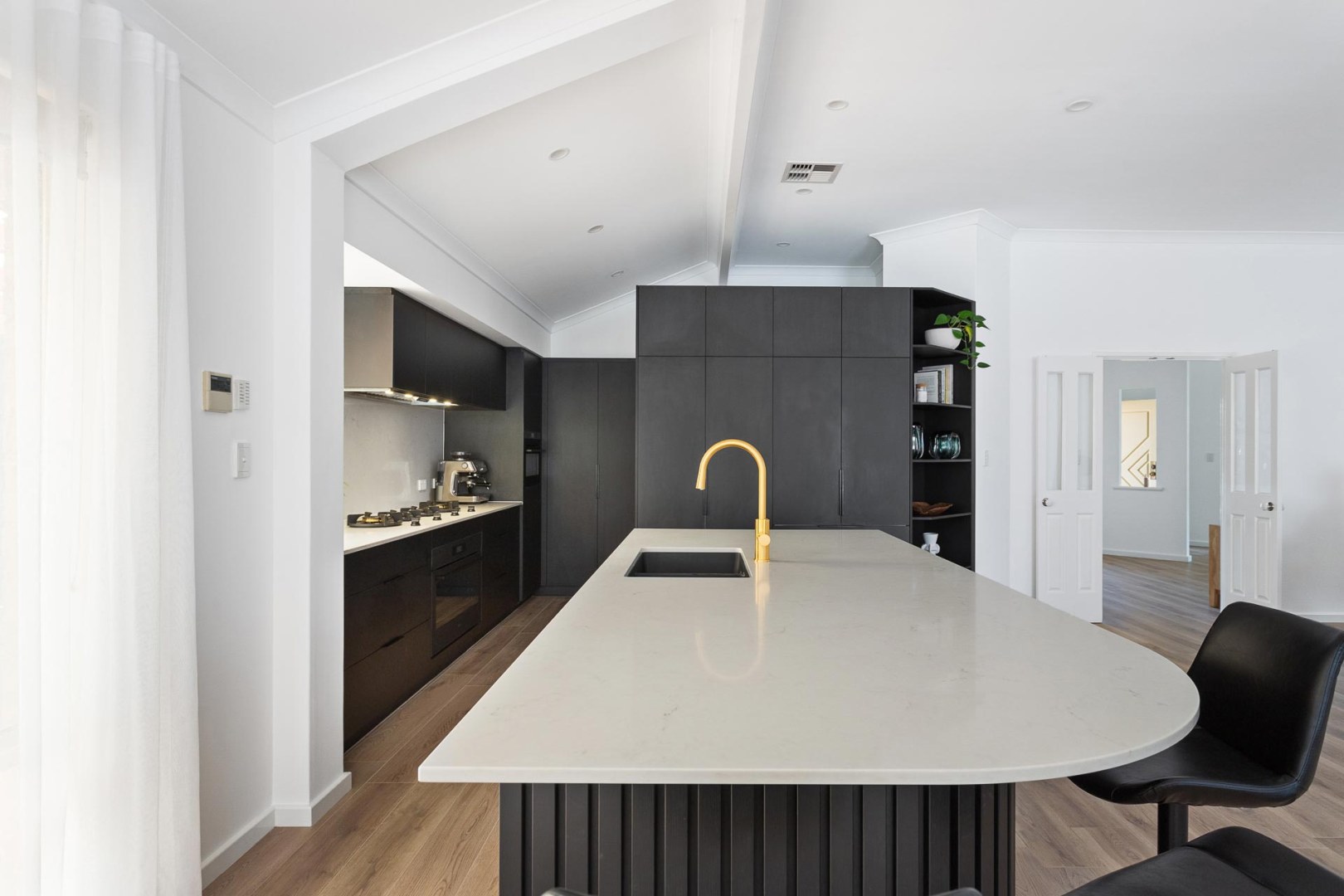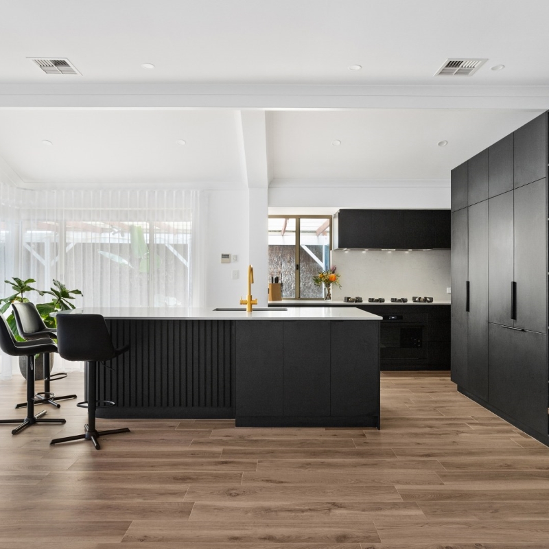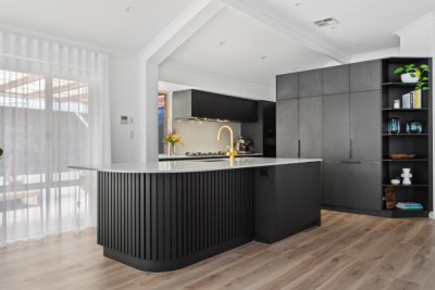 This contemporary and sleek kitchen is a showstopper with it’s moody colour scheme, luxury tall cabinetry design and premium inclusions. The island is the hero with it’s bespoke curved design that features polytec STECCAWOOD on the island base that offers a textural and statement finish. The curved cabinetry and benchtop on the island are an excellent example of how curves soften edges and create an organic flow of elements in your kitchen design.